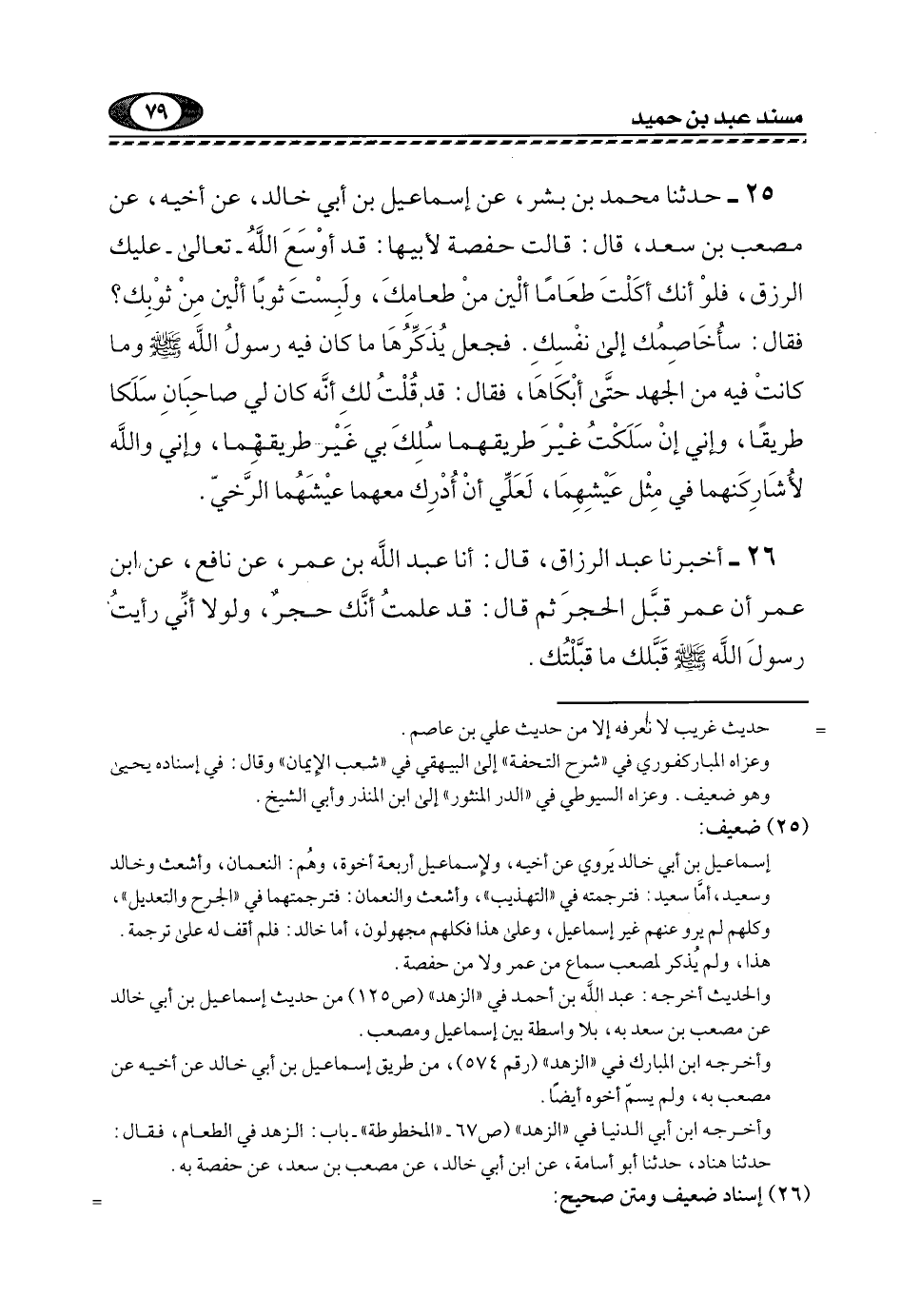 إسماعيل بن أبي خالد يروي عن أخيه، ولإسماعيل أربعة إخوة، وهم: النعمان، وأشعث, وخالد, وسعيد، أما سعيد: فترجمته في "التهذيب"، وأشعث والنعمان: فترجمتهما في "الجرح والتعديل"، وكلهم لم يرو عنهم غير إسماعيل، وعلى هذا فكلهم مجهولون، أما خالد: فلم أقف له على ترجمة. هذا، ولم يذكر لمصعب سماع من عمر ولا من حفصة.