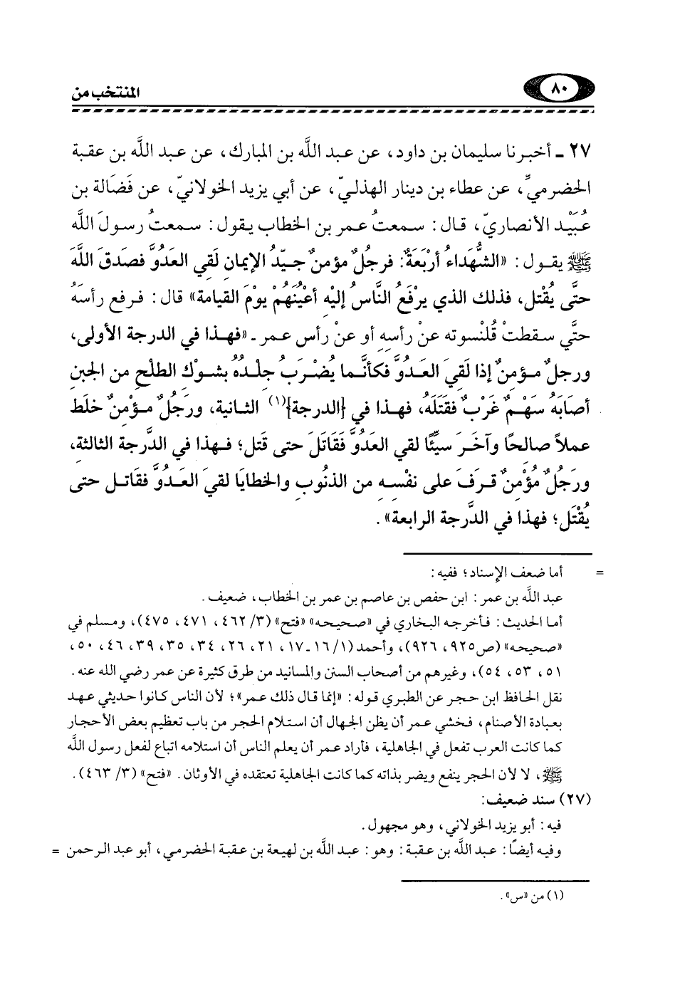 27- أَخْبَرَنَا سُلَيْمَانُ بْنُ دَاوُدَ، عَنْ عَبْدِ اللَّهِ بْنِ الْمُبَارَكِ، عَنْ عَبْدِ اللَّهِ بْنِ عُقْبَةَ الْحَضْرَمِيِّ، عَنْ عَطَاءِ بْنِ دِينَارٍ الْهُذَلِيِّ، عَنْ أَبِي يَزِيدَ الْخَوْلَانِيِّ، عَنْ فَضَالَةَ بْنِ عُبَيْدٍ الْأَنْصَارِيِّ، قَالَ: سَمِعْتُ عُمَرَ بْنَ الْخَطَّابِ يَقُولُ: سَمِعْتُ رَسُولَ اللَّهِ -صَلَّى اللهُ عَلَيْهِ وَسَلَّمَ- يَقُولُ: "الشُّهَدَاءُ أَرْبَعَةٌ: فَرَجُلٌ مُؤْمِنٌ جَيِّدُ الْإِيمَانِ لَقِيَ الْعَدُوَّ فَصَدَقَ اللَّهَ حَتَّى يُقْتَلَ، فَذَلِكَ الَّذِي يَرْفَعُ النَّاسُ إِلَيْهِ أَعْيُنَهُمْ يَوْمَ الْقِيَامَةِ" قَالَ: فَرَفَعَ رَأْسَهُ, حَتَّى سَقَطَتْ قَلَنْسُوَتُهُ عَنْ رَأْسِهِ أَوْ عَنْ رَأْسِ عُمَرَ- "فَهَذَا فِي الدَّرَجَةِ الْأُولَى، وَرَجُلٌ مُؤْمِنٌ إِذَا لَقِيَ الْعَدُوَّ فَكَأَّنَمَا يُضْرَبُ جِلْدُهُ بِشَوْكِ الطَّلْحِ مِنَ الْجُبْنِ أَصَابَهُ سَهْمٌ غَرْب فَقَتَلَهُ، فهذا في [الدرجة] 1 الثَّانِيَةِ, وَرَجُلٌ مُؤْمِنٌ خَلَطَ عَمَلًا صَالِحًا وَآخَرَ سَيِّئًا لَقِيَ الْعَدُوَّ فَقَاتَلَ حَتَّى قُتِلَ؛ فَهَذَا فِي الدَّرَجَةِ الثَّالِثَةِ، وَرَجُلٌ مُؤْمِنٌ قَرَفَ عَلَى نَفْسِهِ مِنَ الذُّنُوبِ وَالْخَطَايَا لَقِيَ الْعَدُوَّ فَقَاتَلَ حَتَّى يُقْتَلَ؛ فهذا في الدرجة الرابعة".