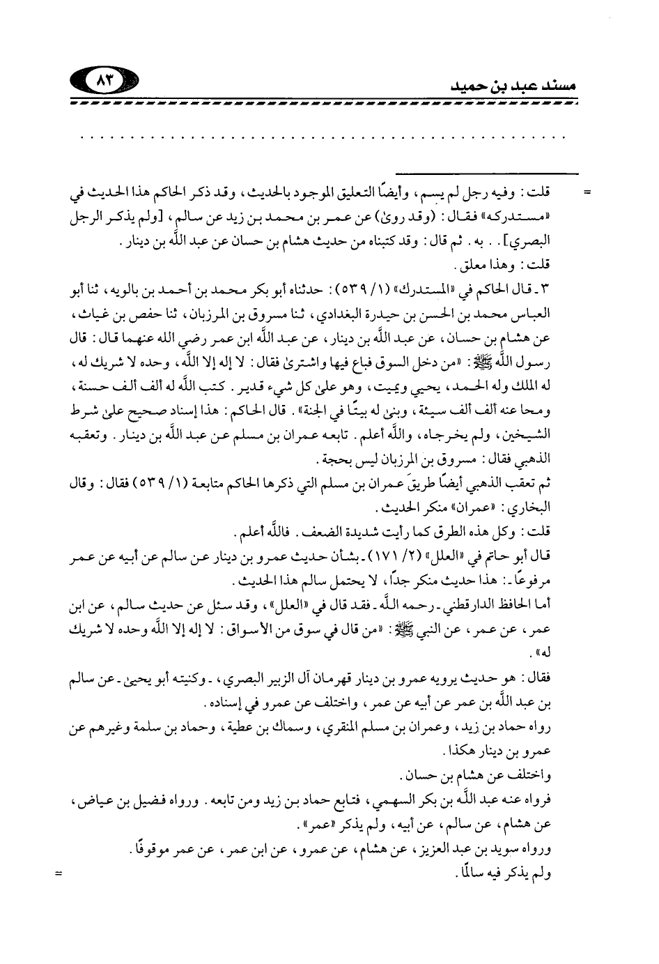 = قلت: وفيه رجل لم يسم، وأيضا التعليق الموجود بالحديث، وقد ذكر الحاكم هذا الحديث في "مستدركه" فقال: "وقد روى" عن عمر بن محمد بن زيد عن سالم، [ولم يذكر الرجل البصري] ... به. ثم قال: وقد كتبناه من حديث هشام بن حسان, عَنْ عَبْدِ اللَّهِ بْنِ دِينَارٍ.