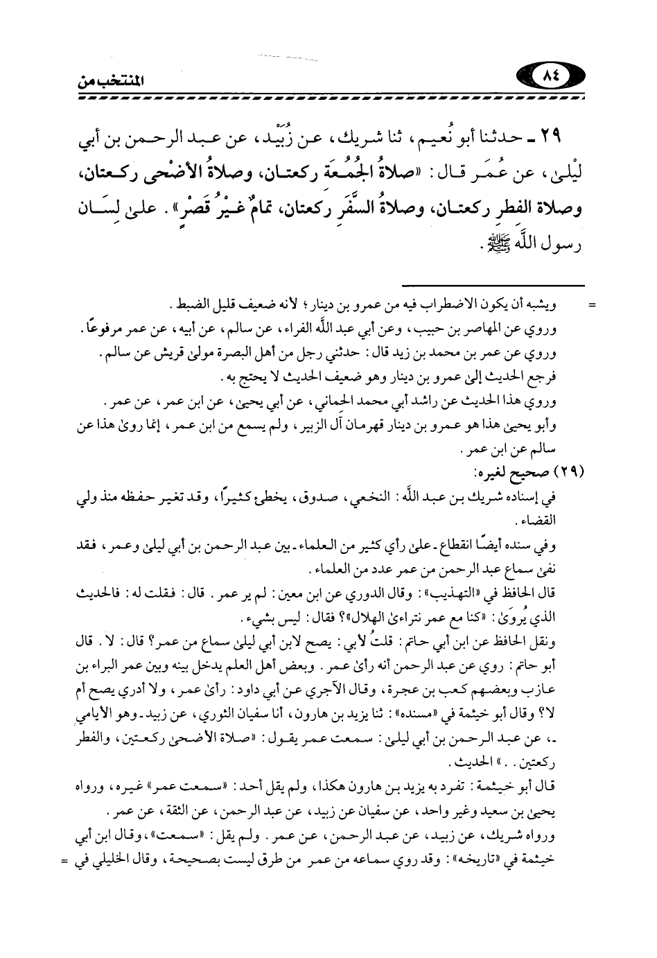 29- حَدَّثَنَا أَبُو نُعَيْمٍ، ثَنَا شَرِيكٌ، عَنْ زُبَيْدٍ، عَنْ عَبْدِ الرَّحْمَنِ بْنِ أَبِي لَيْلَى، عَنْ عُمَرَ قَالَ: "صَلَاةُ الْجُمُعَةِ رَكْعَتَانِ، وَصَلَاةُ الْأَضْحَى رَكْعَتَانِ، وَصَلَاةُ الْفِطْرِ رَكْعَتَانِ، وَصَلَاةُ السَّفَرِ رَكْعَتَانِ، تَمَامٌ غَيْرُ قَصْرٍ" عَلَى لِسَانِ رَسُولِ اللَّهِ, صلى الله عليه وسلم.
