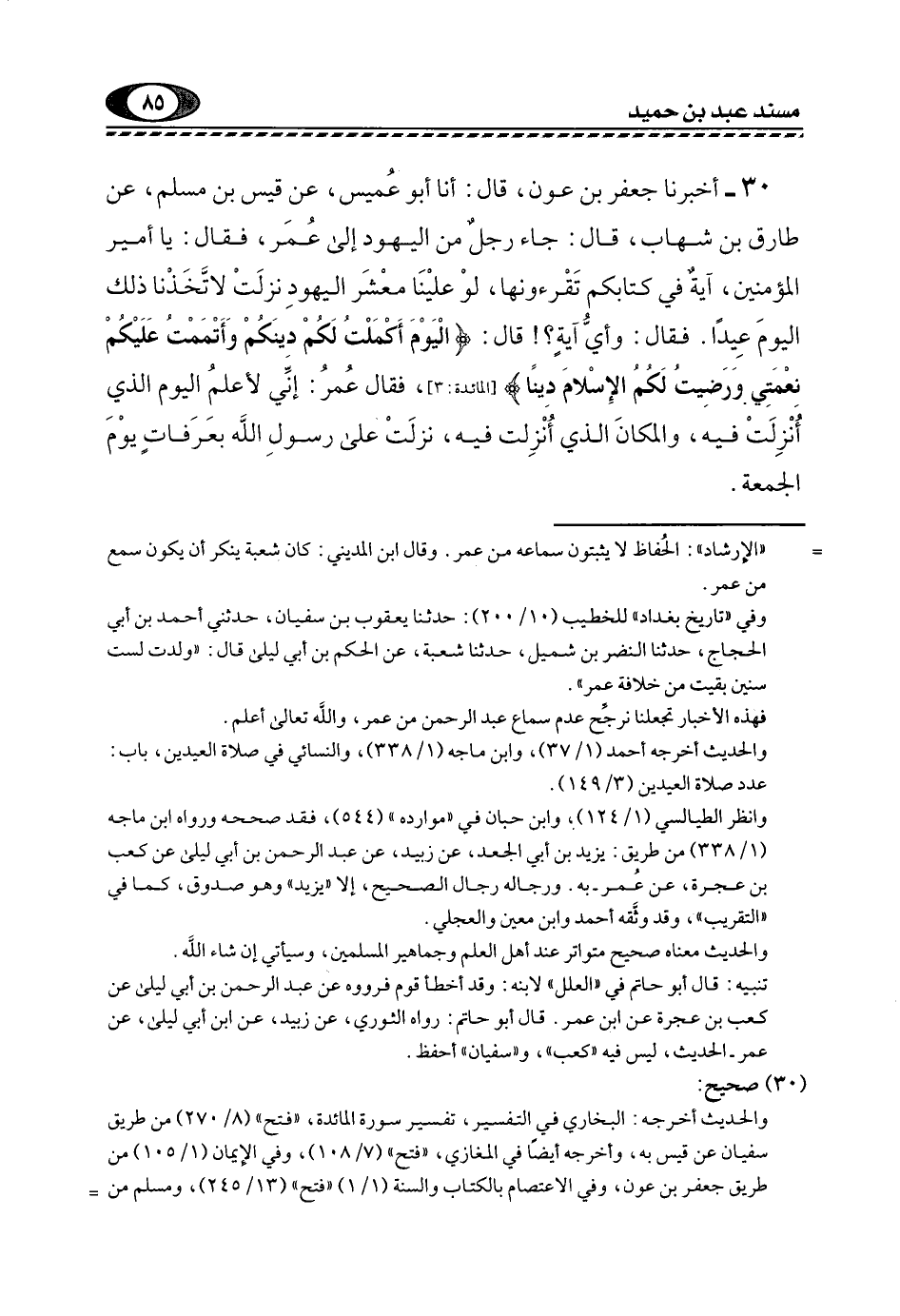 30- أَخْبَرَنَا جَعْفَرُ بْنُ عَوْنٍ، قَالَ: أنا أَبُو عُمَيْسٍ، عَنْ قَيْسِ بْنِ مُسْلِمٍ، عَنْ طَارِقِ بْنِ شِهَابٍ، قَالَ: جَاءَ رَجُلٌ مِنَ الْيَهُودِ إِلَى عُمَرَ، فَقَالَ: يَا أَمِيرَ الْمُؤْمِنِينَ، آيَةٌ فِي كِتَابِكُمْ تَقْرَءُونَهَا، لَوْ عَلَيْنَا مَعْشَرَ الْيَهُودِ نَزَلَتْ لَاتَّخَذْنَا ذَلِكَ الْيَوْمَ عِيدًا. فَقَالَ: وَأَيُّ آيَةٍ؟! قَالَ: {الْيَوْمَ أَكْمَلْتُ لَكُمْ دِينَكُمْ وَأَتْمَمْتُ عَلَيْكُمْ نِعْمَتِي وَرَضِيتُ لَكُمُ الْإِسْلامَ دِينًا} [المائدة: 3] ، فَقَالَ عُمَرُ: إِنِّي لَأَعْلَمُ الْيَوْمَ الَّذِي أُنْزِلَتْ فِيهِ، وَالْمَكَانَ الَّذِي أُنْزِلَتْ فِيهِ؛ نَزَلَتْ عَلَى رسول الله بعرفات يوم الجمعة.