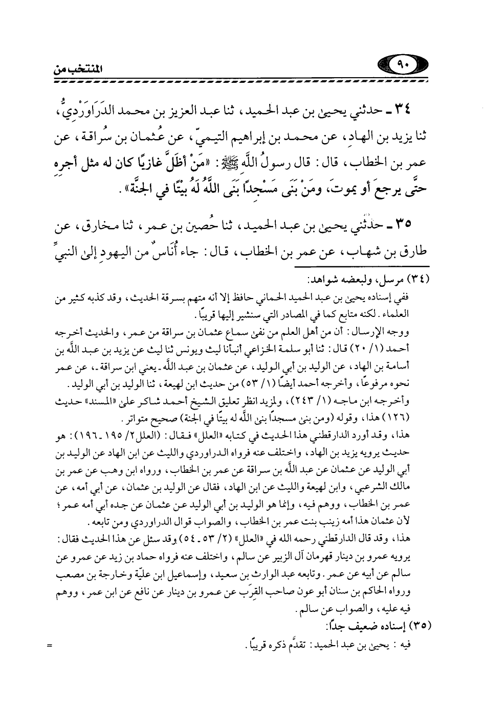 34- حَدَّثَنِي يَحْيَى بْنُ عَبْدِ الْحَمِيدِ، ثَنَا عَبْدُ الْعَزِيزِ بْنُ مُحَمَّدٍ الدَّرَاوَرْدِيُّ، ثَنَا يَزِيدُ بْنُ الْهَادِ، عَنْ مُحَمَّدِ بْنِ إِبْرَاهِيمَ التَّيْمِيِّ، عَنْ عُثْمَانَ بْنِ سُرَاقَةَ، عَنْ عُمَرَ بْنِ الْخَطَّابِ، قَالَ: قَالَ رَسُولَ اللَّهِ, صَلَّى اللهُ عَلَيْهِ وَسَلَّمَ: "مَنْ أَظَلَّ غَازِيًا كَانَ لَهُ مِثْلُ أَجْرِهِ, حَتَّى يَرْجِعَ أَوْ يَمُوتَ، وَمَنْ بَنَى مَسْجِدًا بَنَى اللَّهُ لَهُ بَيْتًا فِي الْجَنَّةِ".