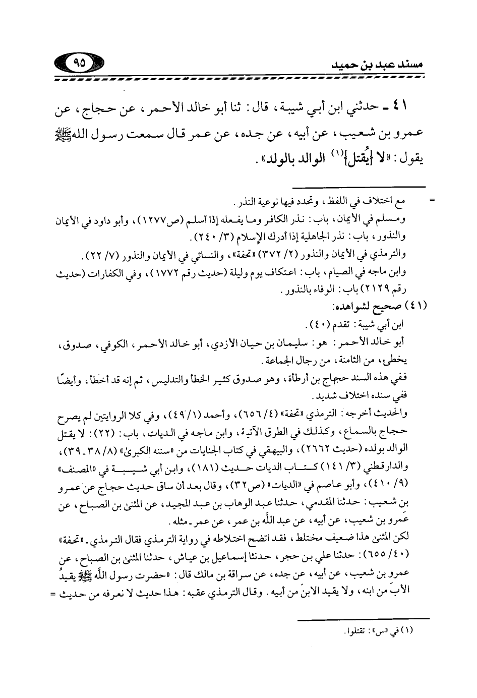 41- حَدَّثَنِي ابْنُ أَبِي شَيْبَةَ، قَالَ: ثَنَا أَبُو خَالِدٍ الْأَحْمَرُ، عَنْ حَجَّاجٍ، عَنْ عَمْرِو بْنِ شُعَيْبٍ، عَنْ أَبِيهِ، عَنْ جَدِّهِ، عَنِ عُمَرَ قَالَ: سَمِعْتُ رَسُولَ اللَّهِ -صَلَّى اللهُ عَلَيْهِ وَسَلَّمَ- يَقُولُ: "لا [يقتل] 1 الوالد بالولد".