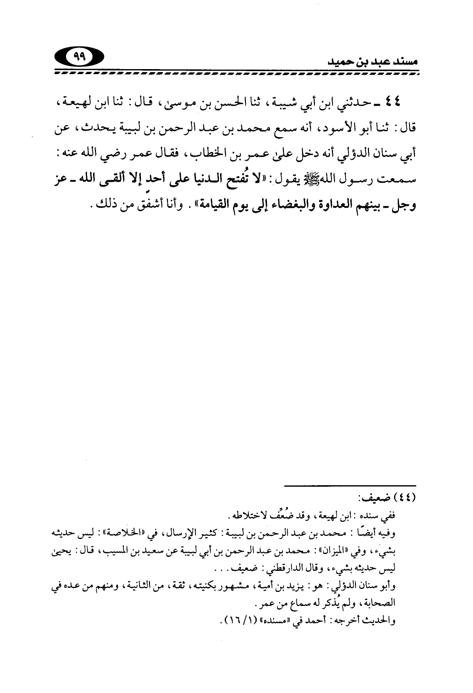 44- حَدَّثَنِي ابْنُ أَبِي شَيْبَةَ، ثَنَا الْحَسَنُ بْنُ مُوسَى، قَالَ: ثَنَا ابْنُ لَهِيعَةَ، قَالَ: ثَنَا أَبُو الْأَسْوَدِ، أَنَّهُ سَمِعَ مُحَمَّدَ بْنَ عَبْدِ الرَّحْمَنِ بْنِ لَبِيبَةَ يُحَدِّثُ، عَنْ أَبِي سِنَانٍ الدُّؤَلِيِّ, أَنَّهُ دَخَلَ عَلَى عُمَرَ بْنِ الْخَطَّابِ، فَقَالَ عُمَرُ رَضِيَ اللَّهُ عَنْهُ: سَمِعْتُ رَسُولَ اللَّهِ -صَلَّى اللهُ عَلَيْهِ وَسَلَّمَ- يَقُولُ: "لَا تُفتح الدُّنْيَا عَلَى أَحَدٍ إِلَّا أَلْقَى اللَّهُ -عَزَّ وَجَلَّ- بَيْنَهُمُ الْعَدَاوَةَ وَالْبَغْضَاءَ إِلَى يَوْمِ الْقِيَامَةِ" وَأَنَا أشفق من ذلك.
