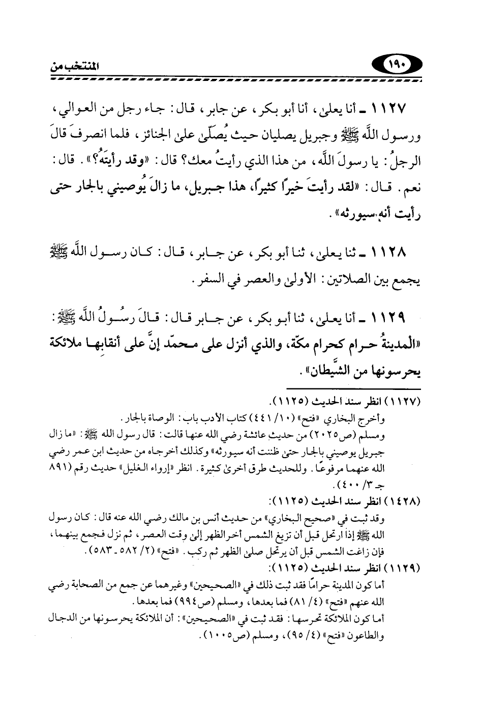 1129- أنا يَعْلَى، ثَنَا أَبُو بَكْرٍ، عَنْ جَابِرٍ قَالَ: قَالَ رَسُولُ اللَّهِ -صَلَّى اللهُ عَلَيْهِ وَسَلَّمَ: "الْمَدِينَةُ حَرَامٌ كَحَرَامِ مَكَّةَ، وَالَّذِي أُنْزِلَ عَلَى مُحَمَّدٍ إِنَّ عَلَى أَنْقَابِهَا مَلَائِكَةً يحرسونها من الشيطان".