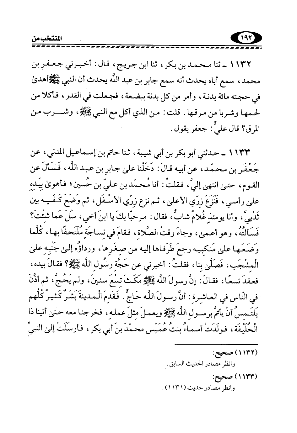 1133- حَدَّثَنِي أَبُو بَكْرِ بْنُ أَبِي شَيْبَةَ، ثَنَا حَاتِمُ بْنُ إِسْمَاعِيلَ الْمَدَنِيُّ، عَنْ جَعْفَرِ بْنِ مُحَمَّدٍ، عَنْ أَبِيهِ قَالَ: دَخَلْنَا عَلَى جَابِرِ بْنِ عَبْدِ اللَّهِ، فَسَأَلَ عَنِ الْقَوْمِ، حَتَّى انْتَهَى إِلَيَّ، فَقُلْتُ: أَنَا مُحَمَّدُ بْنُ عَلِيِّ بْنِ حُسَيْنٍ؛ فَأَهْوَى بِيَدِهِ عَلَى رَأْسِي، فَنَزَعَ زِرِّي الْأَعْلَى، ثُمَّ نَزَعَ زِرِّي الْأَسْفَلَ، ثُمَّ وَضَعَ كَفَّيهِ بَيْنَ ثَدْيَيَّ، وَأَنَا يَوْمَئِذٍ غُلَامٌ شاب، فقال: مرحبا بك يابن أخي، سل عما شِئْتَ؟ فَسَأَلْتُهُ، وَهُوَ أَعْمَى، وَجَاءَ وَقْتُ الصَّلَاةِ، فَقَامَ فِي نِسَاجَةٍ مُلْتَحِفًا بِهَا، كُلَّمَا وَضَعَهَا عَلَى مَنْكِبَيِهِ رَجَعَ طَرَفَاهَا إِلَيْهِ مِنْ صِغَرِهَا، وَرِدَاؤُهُ إِلَى جَنْبِهِ عَلَى الْمِشْجَبِ، فَصَلَّى بِنَا، فَقُلْتُ: أَخْبِرْنِي عَنْ حَجَّةِ رَسُولِ اللَّهِ -صَلَّى اللهُ عَلَيْهِ وَسَلَّمَ؟ فَقَالَ بِيَدِهِ، فَعَقَدَ تِسْعًا، فَقَالَ: إِنَّ رَسُولَ اللَّهِ -صَلَّى اللهُ عَلَيْهِ وَسَلَّمَ- مَكَثَ تِسْعَ سِنِينَ، ولَمْ يَحُجَّ، ثُمَّ أَذَّنَ فِي النَّاسِ فِي الْعَاشِرَةِ: أَنَّ رَسُولَ اللَّهِ حَاجٌّ. فَقَدِمَ الْمَدِينَةَ بَشَرٌ كَثِيرٌ كُلُّهُمْ يَلْتَمِسُ أَنْ يأتمَّ بِرَسُولِ اللَّهِ -صَلَّى اللهُ عَلَيْهِ وَسَلَّمَ- وَيَعْمَلَ مِثْلَ عَمَلِهِ، فَخَرَجْنَا مَعَهُ حَتَّى أَتَيْنَا ذَا الْحُلَيْفَةِ، فَوَلَدَتْ أَسْمَاءُ بِنْتُ عُمَيْسٍ مُحَمَّدَ بْنَ أَبِي بكر، فأرسلت إلى النبي