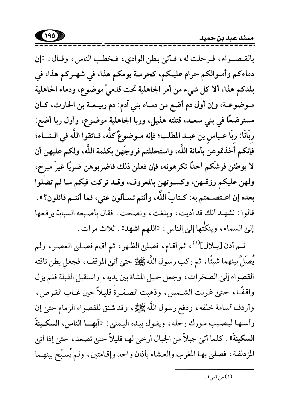 ثُمَّ أذن [بلال] 1، ثُمَّ أَقَامَ، فَصَلَّى الظُّهْرَ، ثُمَّ أَقَامَ فَصَلَّى الْعَصْرَ، وَلَمْ يُصَلِّ بَيْنَهُمَا شَيْئًا، ثُمَّ رَكِبَ رَسُولُ اللَّهِ -صَلَّى اللهُ عَلَيْهِ وَسَلَّمَ- حَتَّى أَتَى الْمَوْقِفَ، فَجَعَلَ بَطْنَ نَاقَتِهِ الْقَصْوَاءِ إِلَى الصَّخَرَاتِ، وَجَعَلَ حَبْلَ الْمُشَاةِ بَيْنَ يَدَيْهِ، وَاسْتَقْبَلَ الْقِبْلَةَ فَلَمْ يَزَلْ وَاقِفًا، حَتَّى غَرَبَتِ الشَّمْسُ، وَذَهَبَتِ الصُّفْرَةُ قَلِيلًا حِينَ غَابَ الْقُرْصُ، وَأَرْدَفَ أُسَامَةَ خَلْفَهُ، وَدَفَعَ رَسُولُ اللَّهِ -صَلَّى اللهُ عَلَيْهِ وَسَلَّمَ- وَقَدْ شَنَقَ لِلْقَصْوَاءِ الزِّمَامَ حَتَّى إِنَّ رَأْسَهَا لَيُصِيبُ مَوْرِكَ رَحْلِهِ، وَيَقُولُ بِيَدِهِ الْيُمْنَى: "أَيُّهَا النَّاسُ، السكينةَ السكينةَ". كُلَّمَا أَتَى جَبْلًا مِنَ الجِبَالِ أَرْخَى لَهَا قَلِيلًا حَتَّى تَصْعَدَ، حتى إذا أَتَى الْمُزْدَلِفَةَ، فَصَلَّى بِهَا الْمَغْرِبَ وَالْعِشَاءَ بِأَذَانٍ وَاحِدٍ وَإِقَامَتَيْنِ، وَلَمْ يسبح بينهما