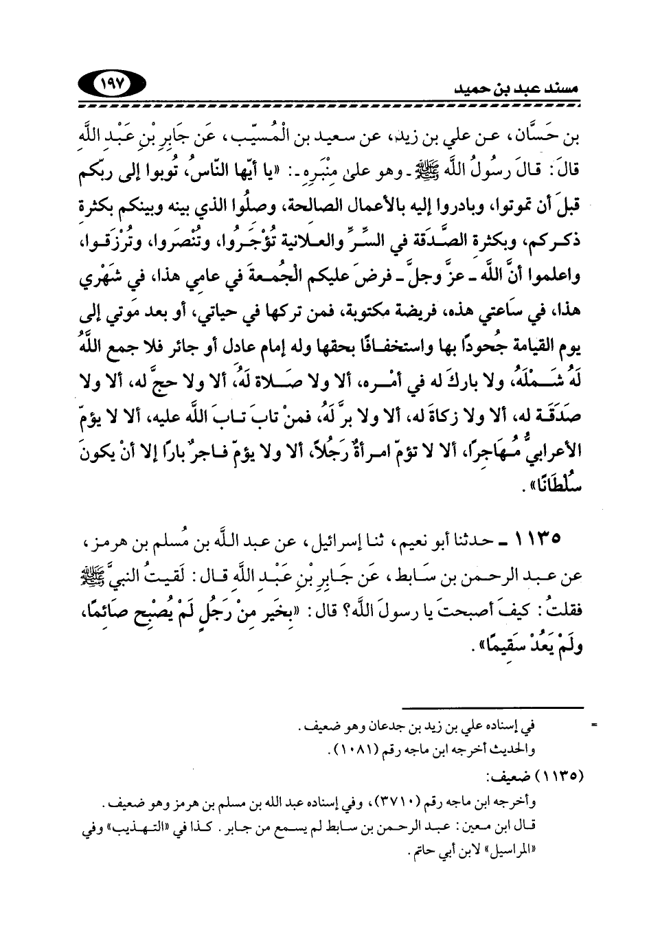 بْنِ حَسَّانَ، عَنْ عَلِيِّ بْنِ زَيْدٍ، عَنْ سَعِيدِ بْنِ الْمُسَيِّبِ، عَنْ جَابِرِ بْنِ عَبْدِ اللَّهِ قَالَ: قَالَ رَسُولُ اللَّهِ -صَلَّى اللهُ عَلَيْهِ وَسَلَّمَ- وَهُوَ عَلَى مِنْبَرِهِ-: "يَا أَيُّهَا النَّاسُ، تُوبُوا إِلَى رَبِّكُمْ قَبْلَ أَنْ تَمُوتُوا، وَبَادِرُوا إِلَيْهِ بِالْأَعْمَالِ الصَّالِحَةِ، وَصِلُوا الَّذِي بَيْنَهُ وَبَيْنكُمْ بِكَثْرَةِ ذِكْرِكُمْ، وَبِكَثْرَةِ الصَّدَقَةِ فِي السِّرِّ وَالْعَلَانِيَّةِ تؤجروا، وتنصروا، وترزقوا، واعملوا إِنَّ اللَّهَ -عَزَّ وَجَلَّ- فَرَضَ عَلَيْكُمُ الْجُمُعَةَ فِي عَامِي هَذَا، فِي شَهْرِي هَذَا، فِي سَاعَتِي هَذِهِ، فَرِيضَةً مَكْتُوبَةً، فَمَنْ تَرَكَهَا فِي حَيَاتِي، أَوْ بَعْدَ مَوْتِي إِلَى يَوْمِ الْقِيَامَةِ جُحُودًا بِهَا وَاسْتِخْفَافًا بِحَقِّهَا وَلَهُ إِمَامٌ عَادِلٌ أَوْ جَائِرٌ فَلَا جَمَعَ اللَّهُ لَهُ شَمْلَهُ، وَلَا بَارَكَ لَهُ فِي أَمْرِهِ، أَلَا وَلَا صَلَاةَ لَهُ، ألَا وَلَا حَجَّ لَهُ، أَلَا وَلَا صَدَقَةَ لَهُ، أَلَا وَلَا زَكَاةَ لَهُ، أَلَا وَلَا بر له، فمن تَابَ اللَّهُ عَلَيْهِ، أَلَا لَا يؤم الأعرابي مهاجرا، ألا تَؤُمَّ امْرَأَةٌ رَجُلًا، أَلَا وَلَا يَؤُمَّ فَاجِرٌ بَارًّا إِلَّا أَنْ يَكُونَ سُلْطَانًا".
