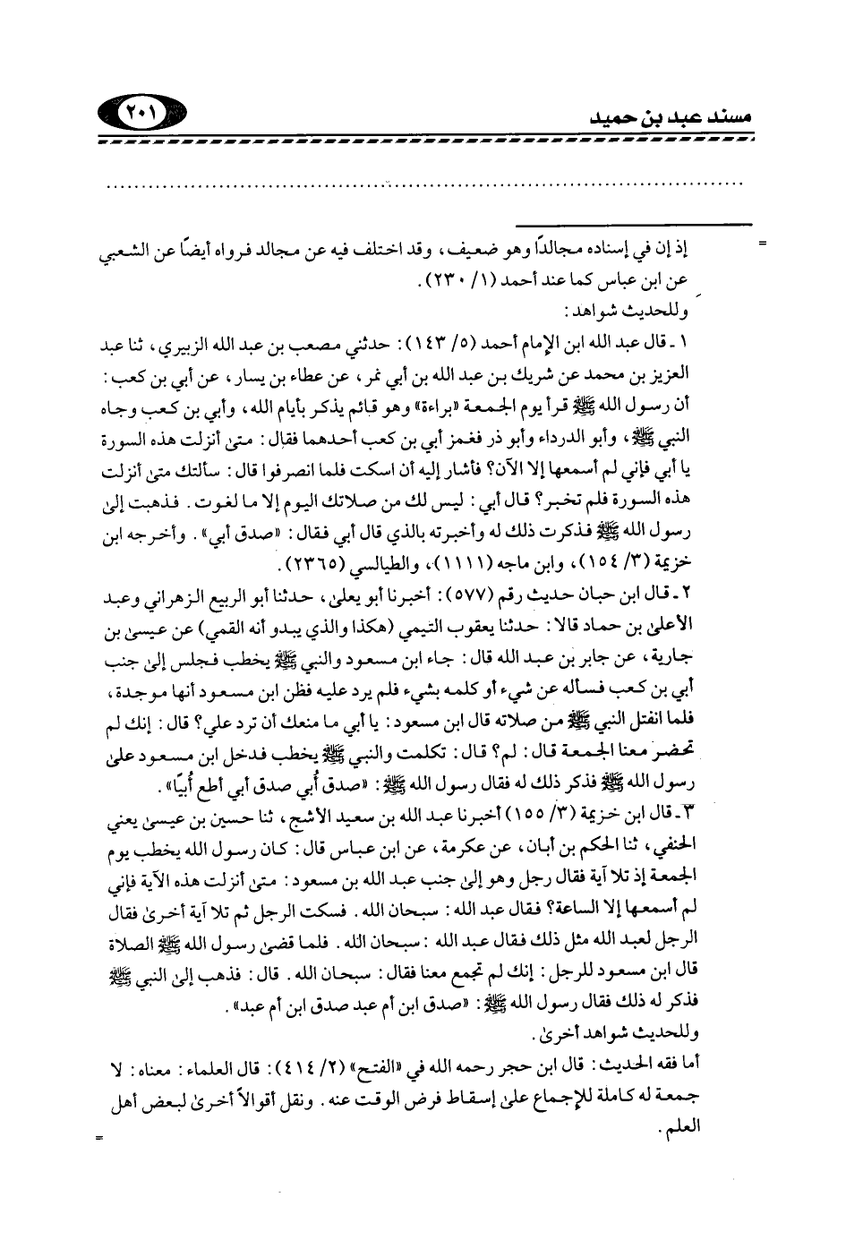 3- قال ابن خزيمة "3/ 155" أخبرنا عبد الله بن سعيد الأشج، ثنا حسين بن عيسى يعني الحنفي، ثنا الحكم بن أبان، عَنْ عِكْرِمَةَ، عَنِ ابْنِ عَبَّاسٍ قال: كان رسول الله يخطب يوم الجمعة إذ تلا آية فقال رجل وهو إلى جنب عبد الله بن مسعود: متى أنزلت هذه الآية فإني لم أسمعها إلا الساعة؟ فقال عبد الله: سبحان الله. فسكت الرجل ثم تلا آية أخرى فقال الرجل لعبد الله مثل ذلك فقال عبد الله: سبحان الله. فلما قضى رَسُولَ اللَّهِ -صَلَّى اللهُ عَلَيْهِ وسلم- الصلاة قال ابن مسعود للرجل: إنك لم تجمع معنا فقال: سبحان الله. قال: فذهب إِلَى النَّبِيِّ -صَلَّى اللهُ عَلَيْهِ وسلم- فذكر له ذلك فَقَالَ رَسُولُ اللَّهِ -صَلَّى اللهُ عليه وسلم: "صدق ابن أم عبد صدق ابن أم عبد".