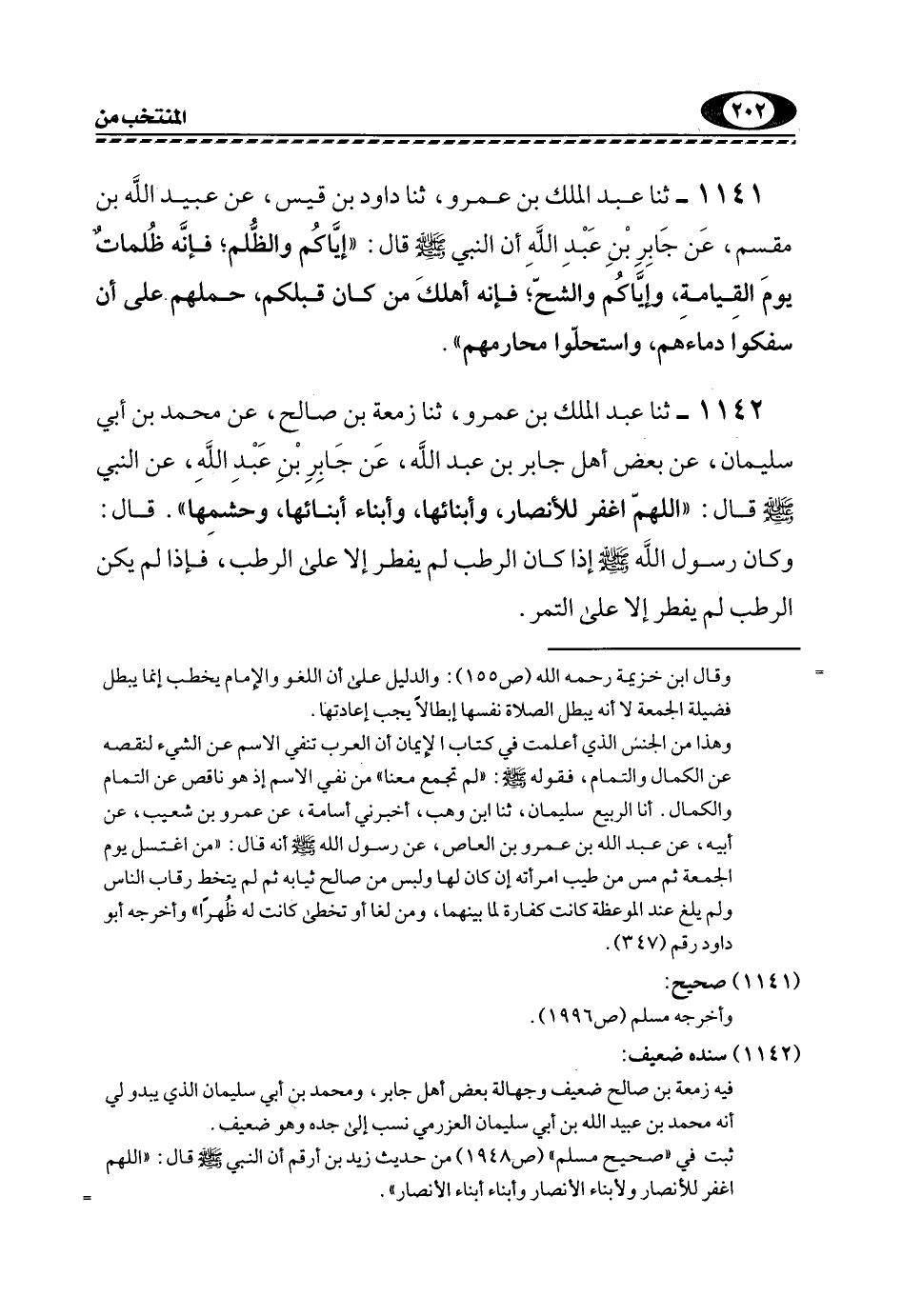 1142- ثنا عَبْدُ الْمَلِكِ بْنُ عَمْرٍو، ثَنَا زَمْعَةُ بْنُ صَالِحٍ، عَنْ مُحَمَّدِ بْنِ أَبِي سُلَيْمَانَ، عَنْ بَعْضِ أَهْلِ جَابِرِ بْنِ عَبْدِ اللَّهِ، عَنْ جَابِرِ بْنِ عَبْدِ اللَّهِ، عَنِ النَّبِيِّ -صَلَّى اللهُ عَلَيْهِ وَسَلَّمَ- قَالَ: "اللَّهُمَّ اغْفِرْ لِلْأَنْصَارِ، وَأَبْنَائِهَا، وَأَبْنَاءِ أَبْنَائِهَا، وَحَشَمِهَا". قَالَ: وَكَانَ رَسُولُ اللَّهِ -صَلَّى اللهُ عَلَيْهِ وَسَلَّمَ- إِذَا كَانَ الرُّطَبُ لَمْ يُفْطِرْ إِلَّا عَلَى الرُّطَبِ، فَإِذَا لَمْ يَكُنِ الرُّطَبُ لَمْ يُفْطِرْ إِلَّا عَلَى التمر.