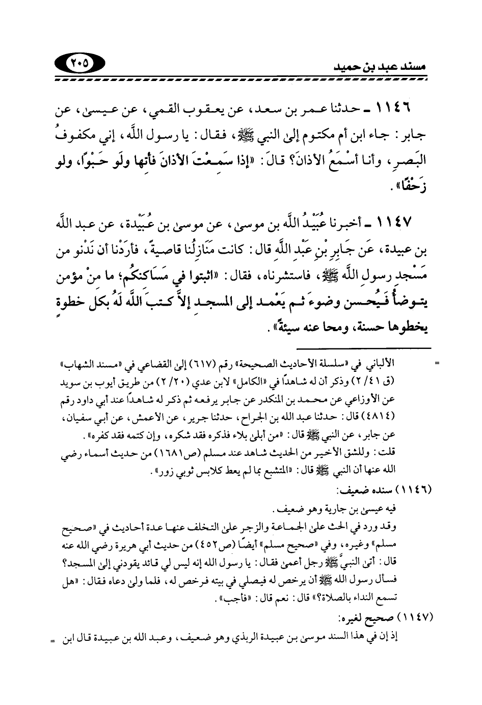 1146- حَدَّثَنَا عُمَرُ بْنُ سَعْدٍ، عَنْ يَعْقُوبَ الْقُمِّيُّ، عَنْ عِيسَى، عَنْ جَابِرٍ: جَاءَ ابْنُ أُمِّ مَكْتومٍ إِلَى النَّبِيِّ -صَلَّى اللهُ عَلَيْهِ وَسَلَّمَ- فَقَالَ: يَا رَسُولَ اللَّهِ، إِنِّي مَكْفُوفُ الْبَصَرِ، وَأَنَا أَسْمَعُ الْأَذَانَ؟ قَالَ: "إِذَا سَمِعْتَ الْأَذَانَ فأتها وَلَوْ حَبْوًا، وَلَوْ زَحْفًا".
