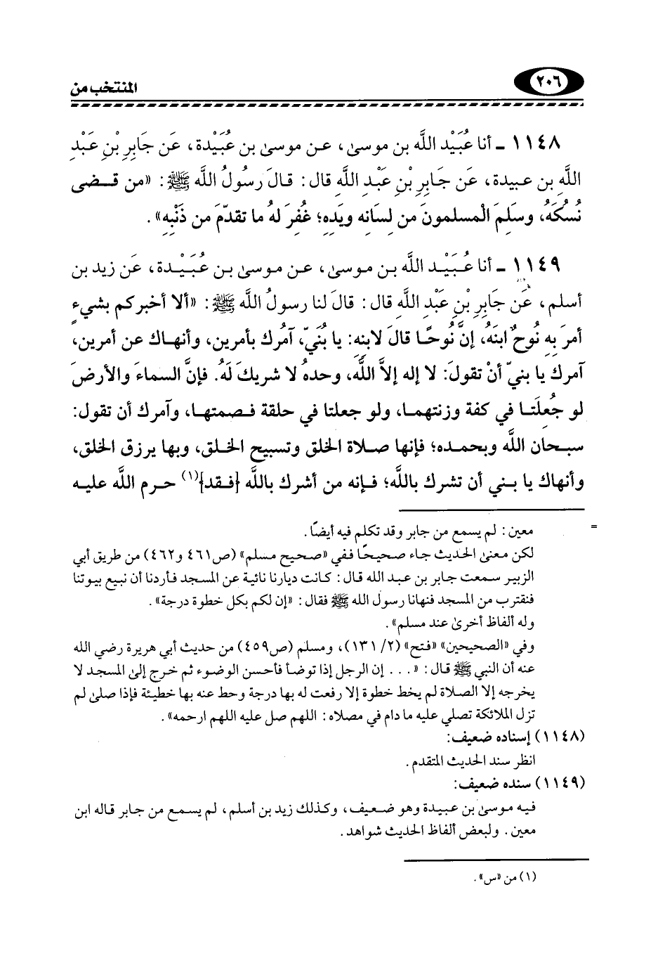 1148- أنا عُبَيْدُ اللَّهِ بْنُ مُوسَى، عَنْ مُوسَى بْنِ عُبَيْدَةَ، عَنْ جَابِرِ بْنِ عَبْدِ اللَّهِ بْنِ عُبَيْدَةَ، عَنْ جَابِرِ بْنِ عَبْدِ اللَّهِ قَالَ: قَالَ رَسُولُ اللَّهِ -صَلَّى اللهُ عَلَيْهِ وَسَلَّمَ: "مَنْ قَضَى نُسُكَهُ، وَسَلِمَ الْمُسْلِمُونَ مِنْ لِسَانِهِ وَيَدِهِ؛ غُفِرَ لَهُ مَا تَقَدَّمَ مِنْ ذَنْبِهِ".