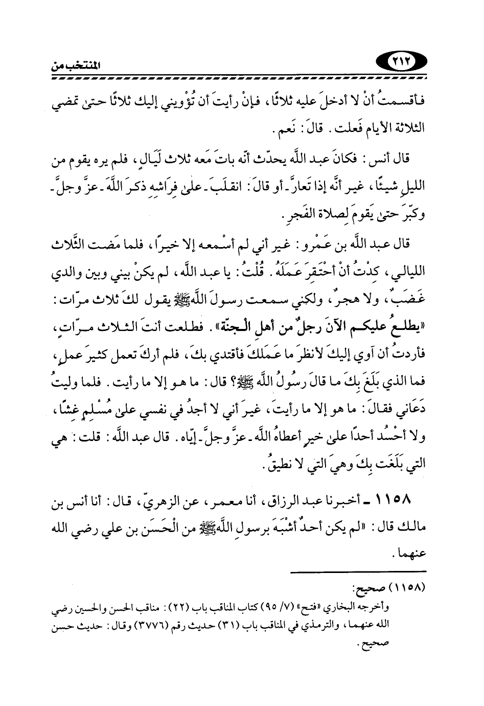 قَالَ عَبْدُ اللَّهِ بْنُ عَمْرٍو: غَيْرَ أَنِّي لَمْ أَسْمَعْهُ إِلَّا خَيْرًا، فَلَمَّا مَضَتِ الثَّلَاثُ اللَّيَالِي، كِدْتُ أَنْ أَحْتَقِرَ عَمَلَهُ. قُلْتُ: يَا عَبْدَ اللَّهِ، لَمْ يَكُنْ بَيْنِي وَبَيْنَ وَالِدِي غَضَبٌ، وَلَا هَجْرٌ، وَلَكِنِّي سَمِعْتُ رَسُولَ اللَّهِ -صَلَّى اللهُ عَلَيْهِ وَسَلَّمَ- يَقُولُ لَكَ ثَلَاثَ مَرَّاتٍ: "يَطْلُعُ عَلَيْكُمُ الْآنَ رَجُلٌ مِنْ أَهْلِ الْجَنَّةِ". فَطَلَعْتَ أَنْتَ الثَّلَاثَ مَرَّاتٍ، فَأَرَدْتُ أَنْ آوِيَ إِلَيْكَ لِأَنْظُرَ مَا عَمَلُكَ فَأَقْتَدِيَ بِكَ، فَلَمْ أَرَكَ تَعْمَلُ كَثِيرَ عَمَلٍ، فَمَا الَّذِي بَلَغَ بِكَ مَا قَالَ رَسُولُ اللَّهِ -صَلَّى اللهُ عَلَيْهِ وَسَلَّمَ؟ قَالَ: مَا هُوَ إِلَّا مَا رَأَيْتَ. فَلَمَّا وَلَّيْتُ دَعَانِي فَقَالَ: مَا هُوَ إِلَّا مَا رَأَيْتَ، غَيْرَ إِنِّي لَا أَجِدُ فِي نَفْسِي عَلَى مُسْلِمٍ غِشًّا، وَلَا أَحْسُدُ أَحَدًا عَلَى خَيْرٍ أَعْطَاهُ اللَّهُ -عَزَّ وَجَلَّ- إِيَّاهُ. قَالَ عَبْدُ اللَّهِ: قُلْتُ: هِيَ الَّتِي بَلَغَتْ بِكَ وَهِيَ الَّتِي لَا نُطِيقُ.