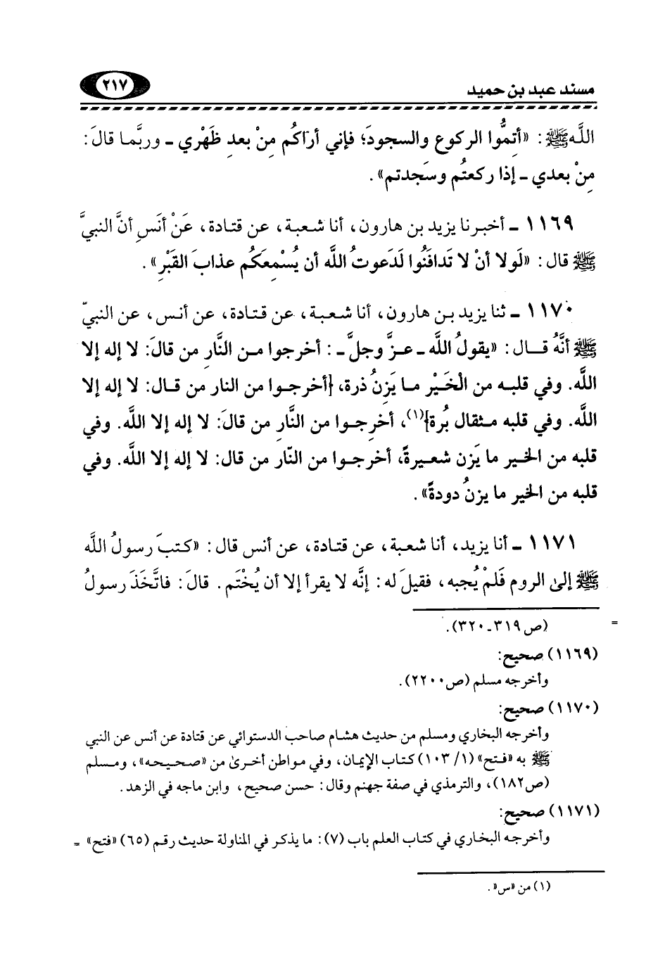 1170- ثنا يَزِيدُ بْنُ هَارُونَ، أنا شُعْبَةُ، عَنْ قَتَادَةَ، عَنْ أَنَسٍ، عَنِ النَّبِيِّ -صَلَّى اللهُ عَلَيْهِ وَسَلَّمَ- أَنَّهُ قَالَ: "يَقُولُ اللَّهُ -عَزَّ وَجَلَّ: أَخْرِجُوا مِنَ النَّارِ مَنْ قَالَ: لَا إله إلا الله. وفي قِلْبِهِ مِنَ الْخَيْرِ مَا يَزِنُ ذَرَّةً، [أَخْرِجُوا مِنَ النَّارِ مَنْ قَالَ: لَا إِلَهَ إِلَّا اللَّهُ. وفي قلبه مثقال برة] 1، أَخْرِجُوا مِنَ النَّارِ مَنْ قَالَ: لا إله إلا الله. وفي قِلْبِهِ مِنَ الْخَيْرِ مَا يَزِنُ شَعِيرَةً، أَخْرِجُوا مِنَ النَّارِ مَنْ قَالَ: لَا إِلَهَ إِلَّا اللَّهُ. وفي قِلْبِهِ مِنَ الْخَيْرِ مَا يَزِنُ دُودَةً".