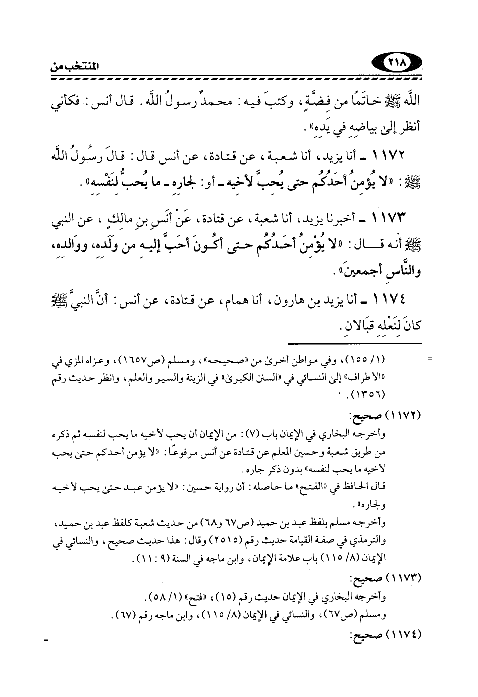 1172- أنا يَزِيدُ، أنا شُعْبَةُ، عَنْ قَتَادَةَ، عَنْ أَنَسٍ قَالَ: قَالَ رَسُولُ اللَّهِ -صَلَّى اللهُ عَلَيْهِ وَسَلَّمَ: "لَا يُؤْمِنُ أَحَدُكُمْ حَتَّى يُحِبَّ لِأَخِيهِ -أَوْ: لِجَارِهِ- مَا يُحِبُّ لِنَفْسِهِ".