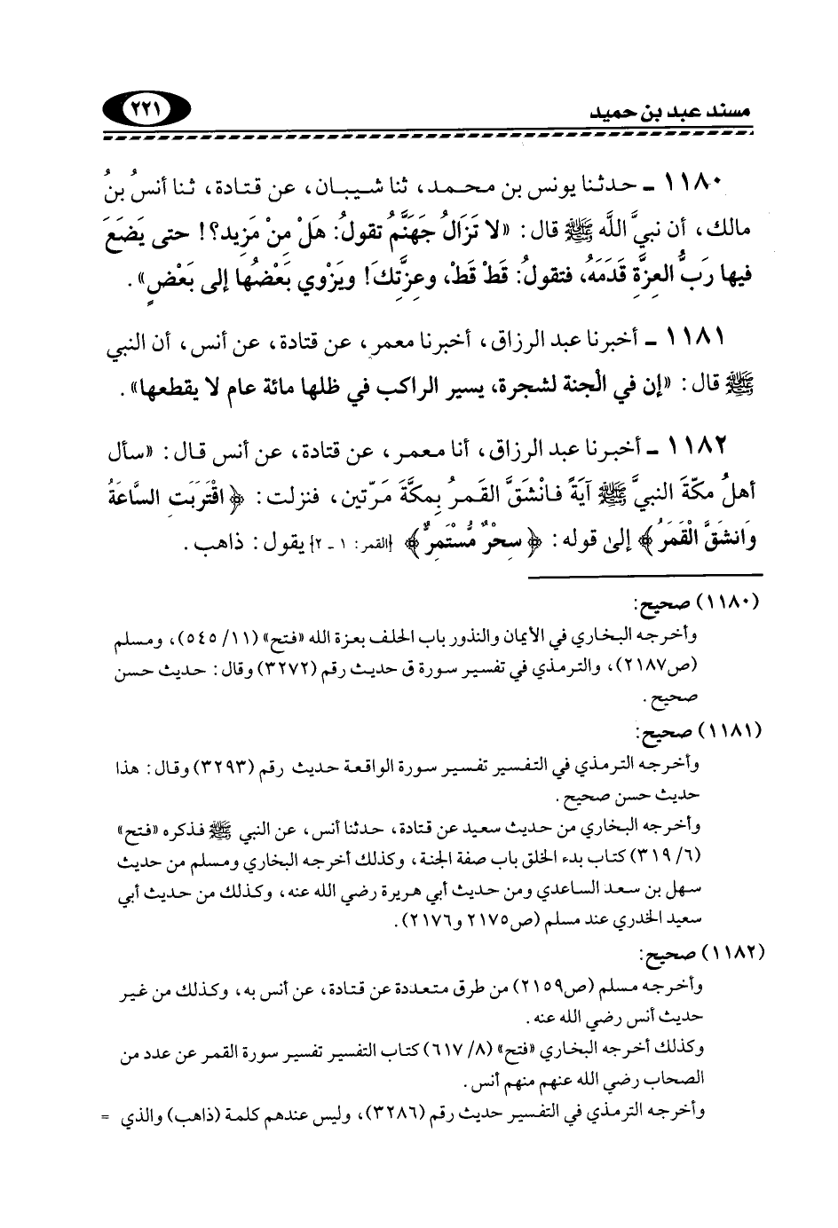 1180- حَدَّثَنَا يُونُسُ بْنُ مُحَمَّدٍ، ثَنَا شَيْبَانُ، عَنْ قَتَادَةَ، ثَنَا أَنَسُ بْنُ مَالْكٍ، أَنَّ نَبِيَّ اللَّهِ -صَلَّى اللهُ عَلَيْهِ وَسَلَّمَ- قَالَ: "لَا تَزَالُ جَهَنَّمَ تَقُولُ: هَلْ مِنْ مَزِيدٍ؟! حَتَّى يَضَعَ فِيهَا رَبُّ الْعِزَّةِ قَدَمَهُ، فَتَقُولَ: قَطْ قَطْ، وَعِزَّتِكَ! وَيُزْوَى بَعْضُهَا إِلَى بَعْضٍ".