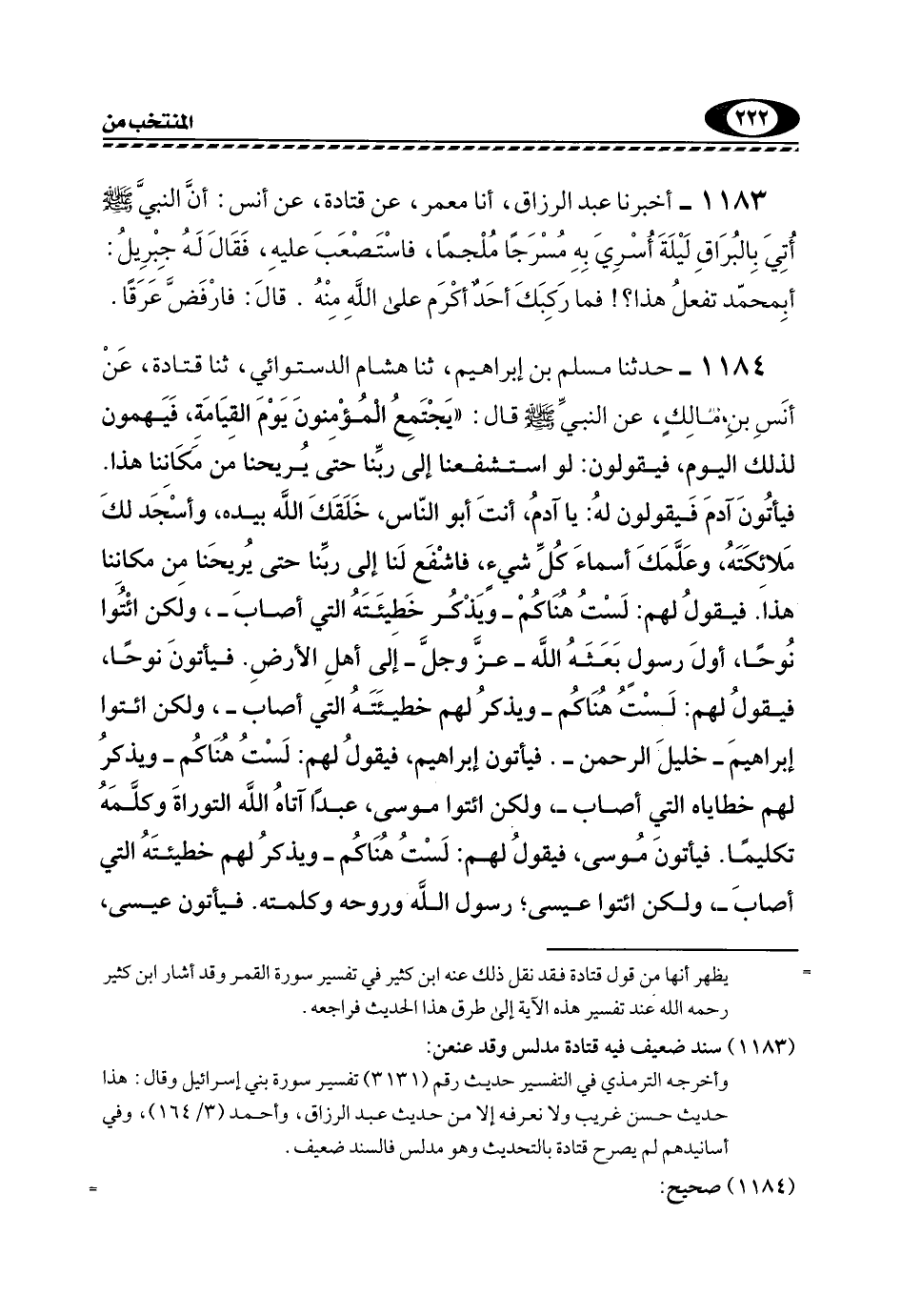 1183- أَخْبَرَنَا عَبْدُ الرَّزَّاقِ، أنا مَعْمَرٌ، عَنْ قَتَادَةَ، عَنْ أَنَسٍ: أَنَّ النَّبِيَّ -صَلَّى اللهُ عَلَيْهِ وَسَلَّمَ- أُتِيَ بِالْبُرَاقِ لَيْلَةَ أُسْرِيَ بِهِ مُسَرَّجًا مُلَجَّمًا، فَاسْتَصْعَبَ عَلَيْهِ، فَقَالَ لَهُ جِبْرِيلُ أَبِمُحَمَّدٍ تَفْعَلُ هَذَا؟! فَمَا رَكِبَكَ أَحَدٌ أَكْرَمُ عَلَى اللَّهِ مِنْهُ. قَالَ: فَارْفَضَّ عَرَقًا.