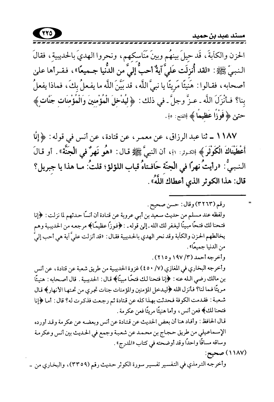 1187- ثنا عَبْدُ الرَّزَّاقِ، عَنْ مَعْمَرٍ، عَنْ قَتَادَةَ، عَنْ أَنَسٍ فِي قَوْلِهِ: {إِنَّا أَعْطَيْنَاكَ الْكَوْثَر} [الكوثر: 1] أَنَّ النَّبِيَّ -صَلَّى اللهُ عَلَيْهِ وَسَلَّمَ- قَالَ: "هُوَ نَهَرٌ فِي الْجَنَّةِ". أَوْ قَالَ النَّبِيُّ: "رَأَيْتُ نَهَرًا فِي الْجَنَّةَ حَافَّتَاهُ قِبَابُ اللُّؤْلُؤِ؛ قُلْتُ: مَا هَذَا يَا جِبْرِيلُ؟ قَالَ: هَذَا الْكَوْثَرُ الَّذِي أعطاك الله".