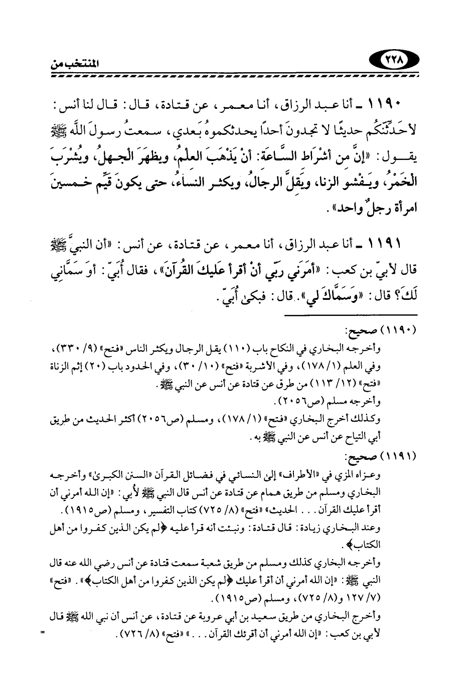 1191- أنا عَبْدُ الرَّزَّاقِ، أنا مَعْمَرٌ، عَنْ قَتَادَةَ، عَنْ أَنَسٍ: "أَنَّ النَّبِيَّ -صَلَّى اللهُ عَلَيْهِ وَسَلَّمَ- قَالَ لِأُبَيِّ بْنِ كَعْبٍ: "أَمَرَنِي رَبِّي أَنْ أَقَرَأَ عَلَيْكَ الْقُرْآنَ"، فَقَالَ أُبَيٌّ: أَوَ سَمَّانِي لَكَ؟ قَالَ: "وَسَمَّاكَ لِي". قَالَ: فَبَكَى أبي.