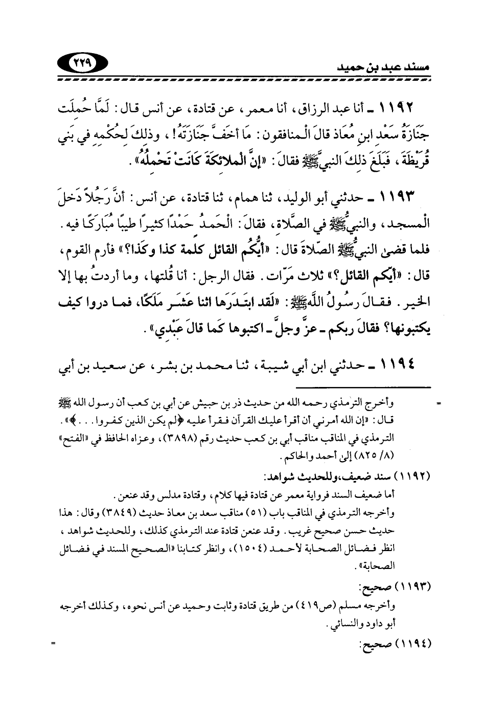 1193- حَدَّثَنِي أَبُو الْوَلِيدِ، ثَنَا هَمَّامُ، ثنا قَتَادَةَ، عَنْ أَنَسٍ: أَنَّ رَجُلًا دَخَلَ الْمَسْجِدَ، وَالنَّبِيُّ -صَلَّى اللهُ عَلَيْهِ وَسَلَّمَ- فِي الصَّلَاةِ، فَقَالَ: الْحَمْدُ حَمْدًا كَثِيرًا طَيِّبًا مُبَارَكًا فِيهِ.