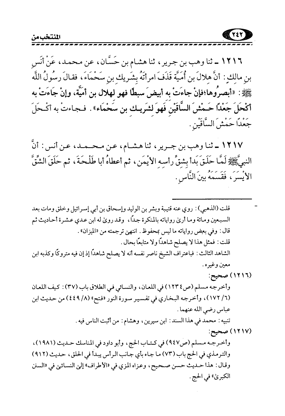 1216- ثَنَا وَهْبُ بْنُ جَرِيرٍ، ثَنَا هِشَامُ بْنُ حَسَّانَ، عَنْ مُحَمَّدِ، عَنْ أَنَسِ بْنِ مَالْكٍ: أَنَّ هِلَالَ بْنَ أُمَيَّةَ قَذَفَ امْرَأَتَهُ بِشَرِيكِ بْنِ سَحْمَاءَ، فَقَالَ رَسُولُ اللَّهِ -صَلَّى اللهُ عَلَيْهِ وَسَلَّمَ: "أَبْصِرُوهَا؛ فَإِنْ جَاءَتْ بِهِ أَبْيَضَ سَبِطًا فَهُوَ لِهَلَالِ بْنِ أُمَيَّةَ، وَإِنْ جَاءَتْ بِهِ أَكْحَلَ جَعْدًا حَمْشَ السَّاقَيْنِ فَهُوَ لِشَرِيكِ بْنِ سَحْمَاءَ". فَجَاءَتْ بِهِ أَكْحَلَ جَعْدًا حَمْشَ السَّاقَيْنِ.
