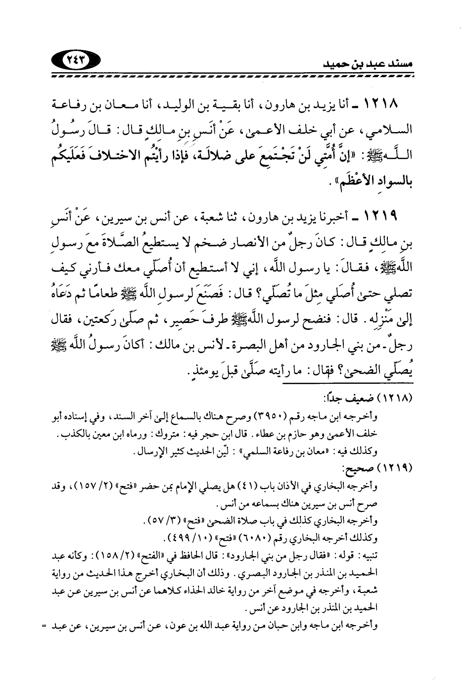 1219- أَخْبَرَنَا يَزِيدُ بْنُ هَارُونَ، ثَنَا شُعْبَةُ، عَنْ أَنَسِ بْنِ سِيرِينَ، عَنْ أَنَسِ بْنِ مَالْكٍ قَالَ: كَانَ رَجُلٌ مِنَ الْأَنْصَارِ ضَخْمٌ لَا يَسْتَطِيعُ الصَّلَاةَ مَعَ رَسُولَ اللَّهِ -صَلَّى اللهُ عَلَيْهِ وَسَلَّمَ- فَقَالَ: يَا رَسُولَ اللَّهِ، إِنِّي لَا أَسْتَطِيعُ أَنْ أُصَلِّيَ مَعَكَ فَأَرِنِي كَيْفَ تُصَلِّي حَتَّى أُصَلِّيَ مِثْلَ مَا تُصَلِّي؟ قَالَ: فَصَنَعَ لِرَسُولِ اللَّهِ -صَلَّى اللهُ عَلَيْهِ وَسَلَّمَ- طَعَامًا ثُمَّ دَعَاهُ إِلَى مَنْزِلِهِ. قَالَ: فَنَضَحَ لِرَسُولِ اللَّهِ -صَلَّى اللهُ عَلَيْهِ وَسَلَّمَ- طَرَفَ حَصِيرٍ، ثُمَّ صَلَّى رَكْعَتَيْنِ، فَقَالَ رَجُلٌ -مِنْ بَنِي الْجَارُودِ مِنْ أَهْلِ الْبَصْرَةِ- لِأَنَسِ بْنِ مَالْكٍ: أَكَانَ رَسُولُ اللَّهِ -صَلَّى اللهُ عَلَيْهِ وَسَلَّمَ- يُصَلِّي الضُّحَى؟ فَقَالَ: مَا رَأَيْتُهُ صَلَّى قَبْلَ يومئذ.