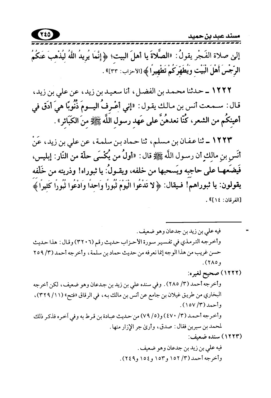 1223- ثنا عَفَّانُ بْنُ مُسْلِمٍ، ثَنَا حَمَّادُ بْنُ سَلَمَةَ، عَنْ عَلِيِّ بْنِ زَيْدٍ، عَنْ أَنَسِ بْنِ مَالْكٍ أَنَّ رَسُولَ اللَّهِ -صَلَّى اللهُ عَلَيْهِ وَسَلَّمَ- قَالَ: "أَوَّلُ مَنْ يُكْسَى حُلَّةً مِنَ النَّارِ: إِبْلِيسُ، فَيَضَعُهَا عَلَى حَاجِبِهِ وَيَسْحَبُهَا مِنْ خَلْفِهِ، وَيَقُولُ: يَا ثُبُورَاهُ! وَذُرِّيَّتُهُ مِنْ خَلْفِهِ يَقُولُونَ: يَا ثُبُورَاهُمْ! فَيُقَالَ: {لَا تَدْعُوا الْيَوْمَ ثُبُورًا وَاحِدًا وَادْعُوا ثُبُورًا كَثِيرًا} [الفرقان: 14] ".