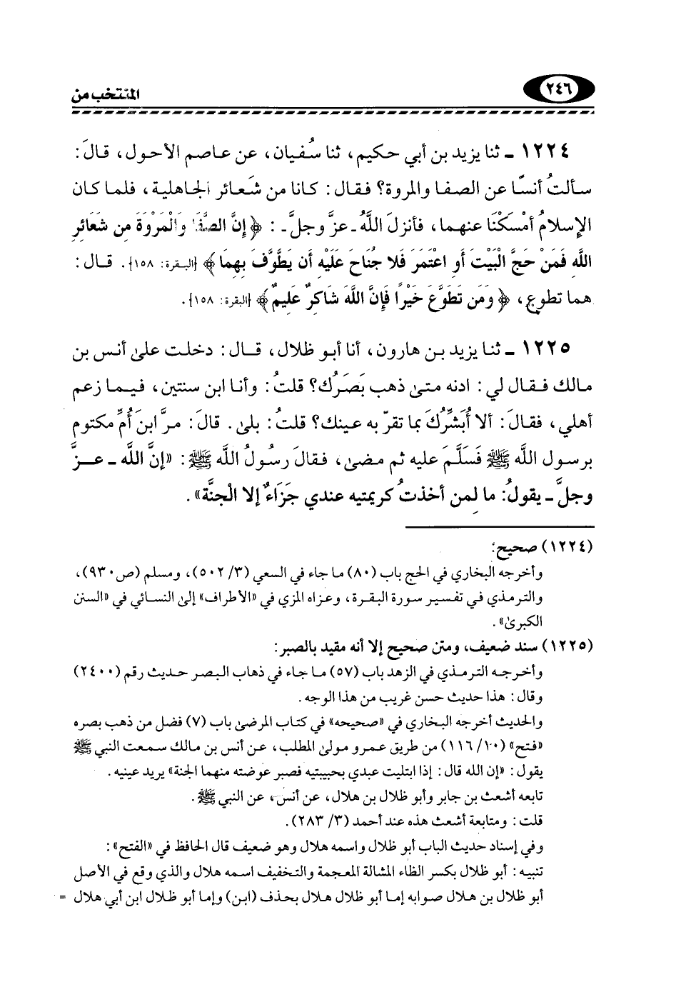 1225- ثنا يَزِيدُ بْنُ هَارُونَ، أنا أَبُو ظِلَالٍ، قَالَ: دَخَلْتُ عَلَى أَنَسِ بْنِ مَالْكٍ فَقَالَ لِي: ادْنُهُ مَتَى ذَهَبَ بَصَرُكَ؟ قُلْتُ: وَأَنَا ابْنُ سَنَتَيْنِ، فِيمَا زَعَمَ أَهْلِي، فَقَالَ: أَلَا أُبَشِّرُكَ بِمَا تَقَرُّ بِهِ عَيْنُكَ؟ قُلْتُ: بَلَى. قَالَ: مَرَّ ابْنُ أُمِّ مَكْتومٍ بِرَسُولِ اللَّهِ -صَلَّى اللهُ عَلَيْهِ وَسَلَّمَ- فَسَلَّمَ عَلَيْهِ ثُمَّ مَضَى، فَقَالَ رَسُولَ اللَّهِ -صَلَّى اللهُ عَلَيْهِ وَسَلَّمَ: "إِنَّ اللَّهَ -عَزَّ وَجَلَّ- يقول: ما لمن أخذت كريمتيه عندي جزاء إلا الجنة".
