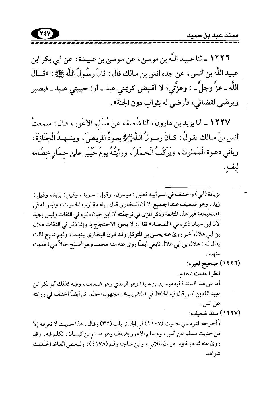 226- ثَنَا عُبَيْدُ اللَّهِ بْنُ مُوسَى، عَنْ مُوسَى بْنِ عُبَيْدَةَ، عَنْ أَبِي بَكْرِ بْنِ عُبَيْدِ اللَّهِ بْنِ أَنَسٍ، عَنْ جَدِّهِ أَنَسِ بْنِ مَالْكٍ قَالَ: قَالَ رَسُولُ اللَّهِ -صَلَّى اللهُ عَلَيْهِ وَسَلَّمَ: "قَالَ اللَّهُ -عَزَّ وَجَلَّ: وَعِزَّتِي؛ لَا أَقْبِضُ كَرِيمَتَيْ عَبْدٍ -أَوْ: حَبِيبَتَيْ عَبْدٍ- فَيَصْبِرُ وَيَرْضَى لِقَضَائِي، فَأَرْضَى لَهُ بِثَوَابٍ دُونَ الْجَنَّةِ".