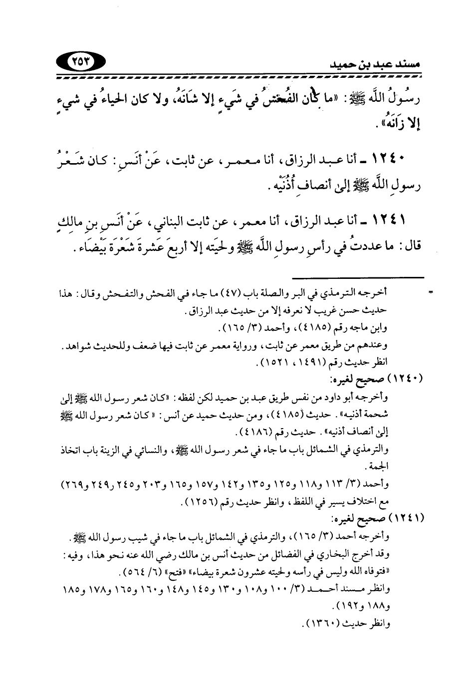 1241- أنا عَبْدُ الرَّزَّاقِ، أنا مَعْمَرٌ، عَنْ ثَابِتٍ الْبُنَانِيِّ، عَنْ أَنَسِ بْنِ مَالْكٍ قَالَ: مَا عَدَدْتُ فِي رَأْسِ رَسُولِ اللَّهِ -صَلَّى اللهُ عَلَيْهِ وَسَلَّمَ- وَلِحْيَتِهِ إِلَّا أربع عشرة شعرة بيضاء.
