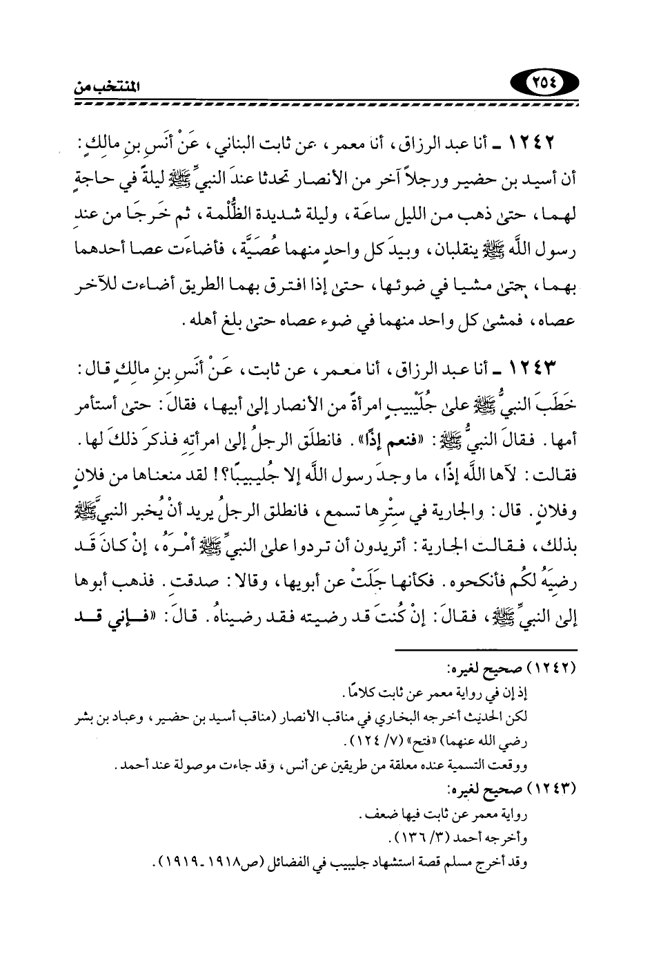 1242- أنا عَبْدُ الرَّزَّاقِ، أنا مَعْمَرٌ، عَنْ ثَابِتٍ الْبُنَانِيِّ، عَنْ أَنَسِ بْنِ مَالْكٍ: أَنَّ أُسَيْدَ بْنَ حُضَيْرٍ وَرَجُلًا آخَرَ مِنَ الْأَنْصَارِ تَحَدَّثَا عِنْدَ النَّبِيِّ -صَلَّى اللهُ عَلَيْهِ وَسَلَّمَ- لَيْلَةً فِي حَاجَةٍ لَهُمَا، حَتَّى ذَهَبَ مِنَ اللَّيْلِ سَاعَةٌ، وَلَيْلَةٌ شَدِيدَةُ الظُّلْمَةِ، ثُمَّ خَرَجَا مِنْ عِنْدَ رَسُولِ اللَّهِ -صَلَّى اللهُ عَلَيْهِ وَسَلَّمَ- يَنْقَلِبَانِ، وَبِيَدِ كُلِّ وَاحِدٍ مِنْهُمَا عُصَيَّة، فَأَضَاءَتْ عَصَا أَحَدِهِمَا بِهِمَا، حَتَّى مَشَيَا فِي ضَوْئِهَا، حَتَّى إِذَا افْتَرَقَ بِهِمَا الطَّرِيقُ أَضَاءَتْ لِلْآخَرِ عَصَاهُ، فَمَشَى كُلُّ وَاحِدٍ مِنْهُمَا فِي ضَوْءِ عَصَاهُ حَتَّى بَلَغَ أَهْلَهُ.