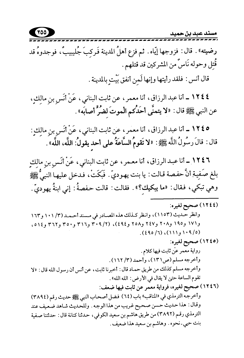 1246- أنا عَبْدُ الرَّزَّاقِ، أنا مَعْمَرٌ، عَنْ ثَابِتٍ الْبُنَانِيِّ، عَنْ أَنَسِ بْنِ مَالْكٍ بَلَغَ صَفِيَّةَ أَنَّ حَفْصَةَ قَالَتْ: يَا بِنْتَ يَهُودِيٍّ. فَبَكَتْ، فَدَخَلَ عَلَيْهَا النَّبِيُّ -صَلَّى اللهُ عَلَيْهِ وَسَلَّمَ- وَهِيَ تَبْكِي، فَقَالَ: "مَا يُبْكِيكَ؟ ". فَقَالَتْ: قَالَتْ حَفْصَةُ: إني ابنة يهودي.