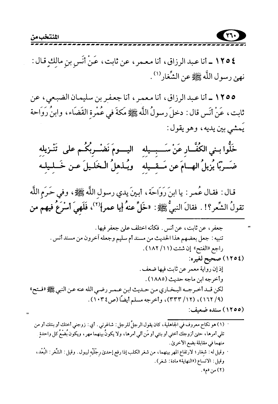 1254- أنا عَبْدُ الرَّزَّاقِ، أنا مَعْمَرٌ، عَنْ ثَابِتٍ، عَنْ أَنَسِ بْنِ مَالْكٍ قَالَ: نَهَى رَسُولُ اللَّهِ -صَلَّى اللهُ عَلَيْهِ وَسَلَّمَ- عَنْ الشِّغَارِ1.
