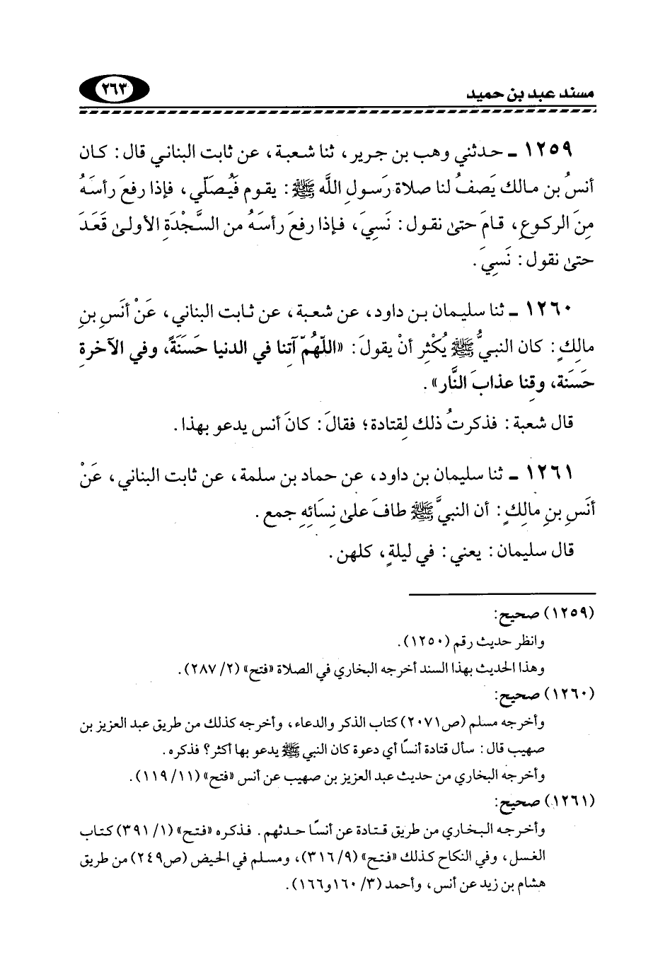 1260- ثنا سُلَيْمَانُ بْنُ دَاوُدَ، عَنْ شُعْبَةَ، عَنْ ثَابِتٍ الْبُنَانِيِّ، عَنْ أَنَسِ بْنِ مَالْكٍ: كَانَ النَّبِيُّ -صَلَّى اللهُ عَلَيْهِ وَسَلَّمَ- يُكْثِرُ أَنْ يَقُولُ: "اللَّهُمَّ آتِنَا فِي الدُّنْيَا حَسَنَةً، وَفِي الْآخِرَةِ حَسَنَةً، وَقِنَا عَذَابَ النَّارِ".