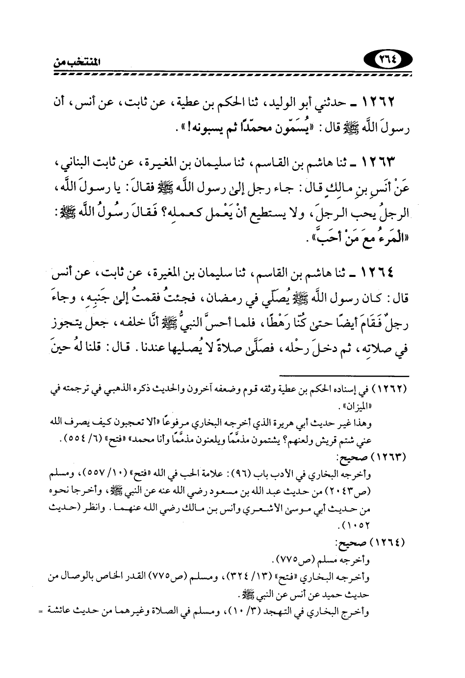 1263- ثنا هَاشِمُ بْنُ الْقَاسِمِ، ثَنَا سُلَيْمَانُ بْنُ الْمُغِيرَةِ، عَنْ ثَابِتٍ الْبُنَانِيِّ، عَنْ أَنَسِ بْنِ مَالْكٍ قَالَ: جَاءَ رَجُلٌ إِلَى رَسُولِ اللَّهِ -صَلَّى اللهُ عَلَيْهِ وَسَلَّمَ- فَقَالَ: يَا رَسُولَ اللَّهِ، الرَّجُلُ يُحِبُّ الرَّجُلَ، وَلَا يَسْتَطِيعُ أَنْ يَعْمَلَ كَعَمَلِهِ؟ فَقَالَ رَسُولُ اللَّهِ -صَلَّى اللهُ عَلَيْهِ وَسَلَّمَ: "الْمَرْءُ مَعَ مَنْ أَحَبَّ".