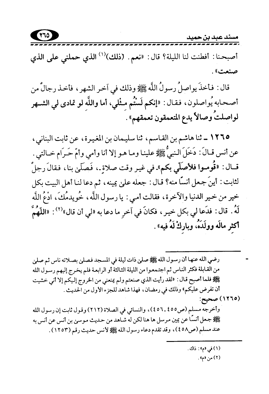 1265- ثنا هَاشِمُ بْنُ الْقَاسِمِ، ثَنَا سُلَيْمَانُ بْنُ الْمُغِيرَةِ، عَنْ ثَابِتٍ الْبُنَانِيِّ، عَنْ أَنَسٍ قَالَ: دَخَلَ النَّبِيُّ -صَلَّى اللهُ عَلَيْهِ وَسَلَّمَ- عَلَيْنَا وَمَا هُوَ إِلَّا أَنَا وَأُمِّي وَأُمُّ حَرَامٍ خَالَتِي.