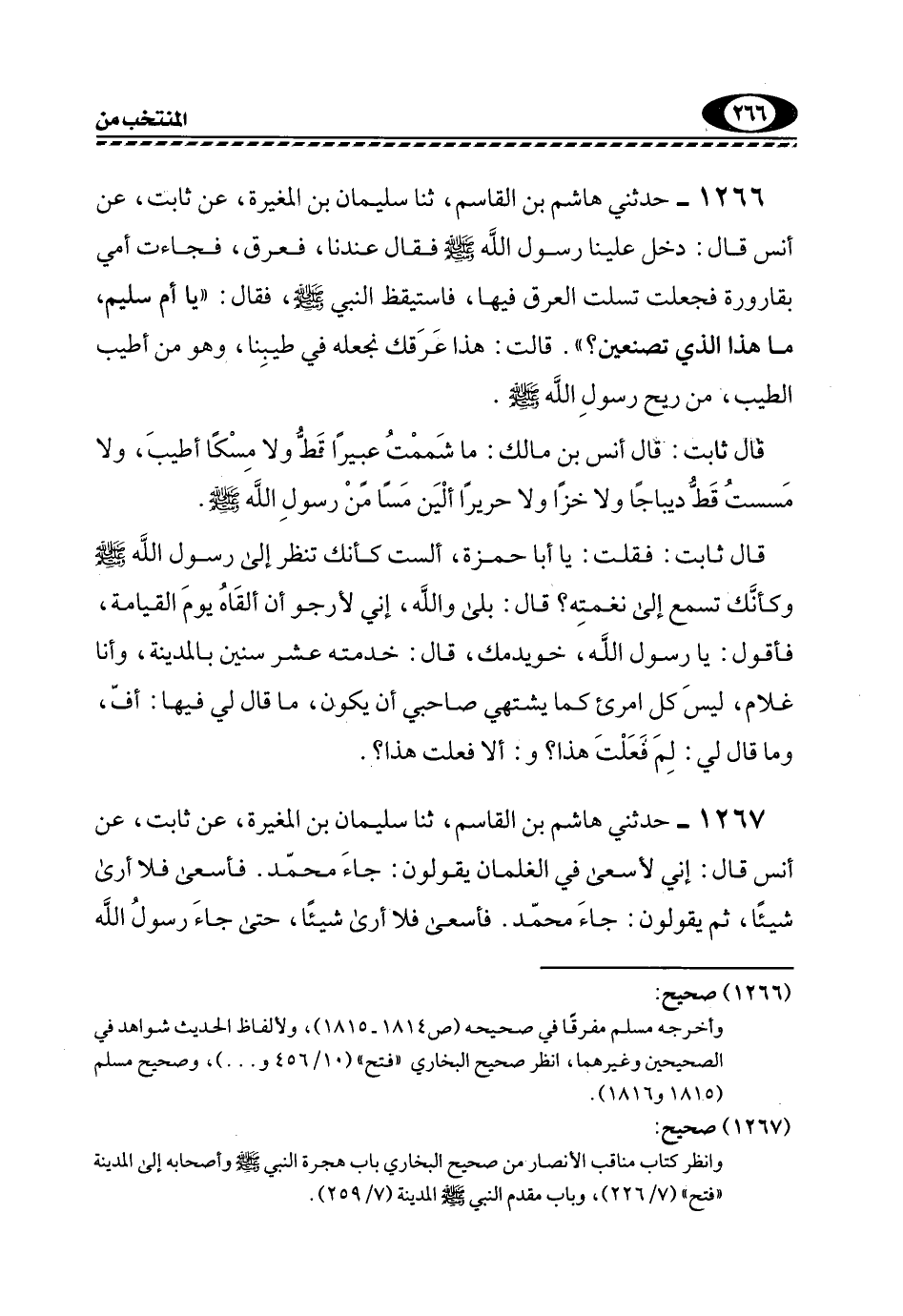 1266- حَدَّثَنِي هَاشِمُ بْنُ الْقَاسِمِ، ثَنَا سُلَيْمَانُ بْنُ الْمُغِيرَةِ، عَنْ ثَابِتٍ، عَنْ أَنَسٍ قَالَ: دَخَلَ عَلَيْنَا رَسُولَ اللَّهِ -صَلَّى اللهُ عَلَيْهِ وَسَلَّمَ- فَقَالَ عِنْدَنَا، فَعَرِقَ، فَجَاءَتْ أُمِّي بِقَارُورَةٍ فَجَعَلَتْ تَسْلِتُ الْعَرَقَ فِيهَا، فَاسْتَيْقَظَ النَّبِيُّ -صَلَّى اللهُ عَلَيْهِ وَسَلَّمَ- فَقَالَ: "يَا أُمَّ سُلَيْمٍ، مَا هَذَا الَّذِي تَصْنَعِينَ؟ ". قالت: هذا عرقك نجعله فِي طِيبِنَا، وَهُوَ مِنْ أَطْيَبِ الطِّيبِ، مِنْ رِيحِ رَسُولِ اللَّهِ -صَلَّى اللهُ عَلَيْهِ وَسَلَّمَ.