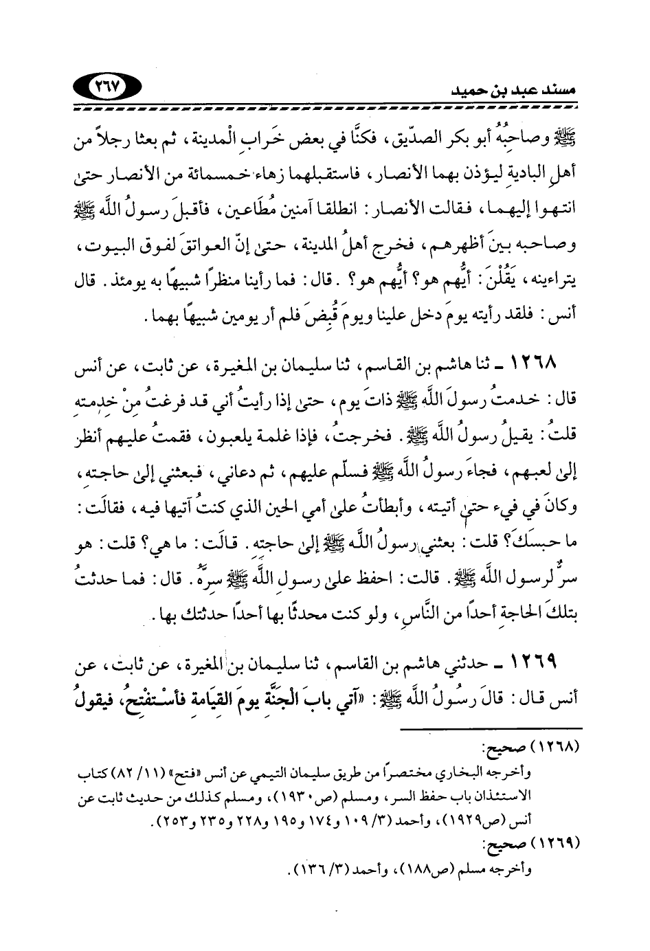 1268- ثنا هَاشِمُ بْنُ الْقَاسِمِ، ثَنَا سُلَيْمَانُ بْنُ الْمُغِيرَةِ، عَنْ ثَابِتٍ، عَنْ أَنَسٍ قَالَ: خَدَمْتُ رَسُولَ اللَّهِ -صَلَّى اللهُ عَلَيْهِ وَسَلَّمَ- ذَاتَ يَوْمٍ، حَتَّى إِذَا رَأَيْتُ أَنِّي قَدْ فَرَغْتُ مِنْ خِدْمَتِهِ قُلْتُ: يَقِيلُ رَسُولُ اللَّهِ -صَلَّى اللهُ عَلَيْهِ وَسَلَّمَ. فَخَرَجْتُ، فَإِذَا غِلْمَةٌ يَلْعَبُونَ، فَقُمْتُ عَلَيْهِمْ أَنْظُرُ إِلَى لَعِبِهِمْ، فَجَاءَ رَسُولَ اللَّهِ -صَلَّى اللهُ عَلَيْهِ وَسَلَّمَ- فَسَلَّمَ عَلَيْهِم، ثُمَّ دَعَانِي، فَبَعَثَنِي إِلَى حَاجَتِهِ، وَكَانَ فِي فَيْءٍ حَتَّى أَتَيْتُهُ، وَأَبْطَأْتُ عَلَى أُمِّي الْحِينَ الَّذِي كُنْتُ آتِيهَا فِيهِ، فَقَالَتْ: مَا حَبَسَكَ؟ قُلْتُ: بَعَثَنِي رَسُولُ اللَّهِ -صَلَّى اللهُ عَلَيْهِ وَسَلَّمَ- إِلَى حَاجَتِهِ. قَالَتْ: مَا هِيَ؟ قُلْتُ: هُوَ سِرٌّ لِرَسُولِ اللَّهِ -صَلَّى اللهُ عَلَيْهِ وَسَلَّمَ- قَالَتْ: احْفَظْ عَلَى رَسُولِ اللَّهِ -صَلَّى اللهُ عَلَيْهِ وَسَلَّمَ- سِرَّهُ. قَالَ: فَمَا حَدَّثْتُ بِتِلْكَ الْحَاجَةِ أَحَدًا مِنَ النَّاسِ، وَلَوْ كُنْتُ مُحَدِّثًا بِهَا أَحَدًا حَدَّثْتُكَ بِهَا.