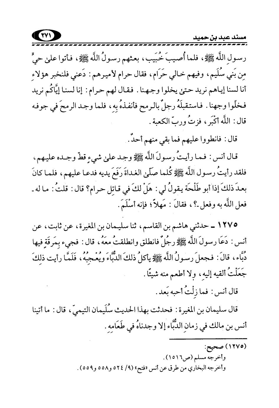 1275- حَدَّثَنِي هَاشِمُ بْنُ الْقَاسِمِ، ثَنَا سُلَيْمَانُ بْنُ الْمُغِيرَةِ، عَنْ ثَابِتٍ، عَنْ أَنَسٍ: دَعَا رَسُولُ اللَّهِ -صَلَّى اللهُ عَلَيْهِ وَسَلَّمَ- رَجُلٌ فَانْطَلَقَ وَانْطَلَقْتُ مَعَهُ، قَالَ: فَجِيءَ بِمَرَقَةٍ فِيهَا دُبَّاءٌ، قَالَ: فَجَعَلَ رَسُولَ اللَّهِ -صَلَّى اللهُ عَلَيْهِ وسلم- يأكل الدُّبَّاءَ وَيُعْجِبُهُ، فَلَمَّا رَأَيْتُ ذَلِكَ جَعَلْتُ أَلْقِيهِ إِلَيْهِ، وَلَا أَطْعَمُ مِنْهُ شَيْئًا.