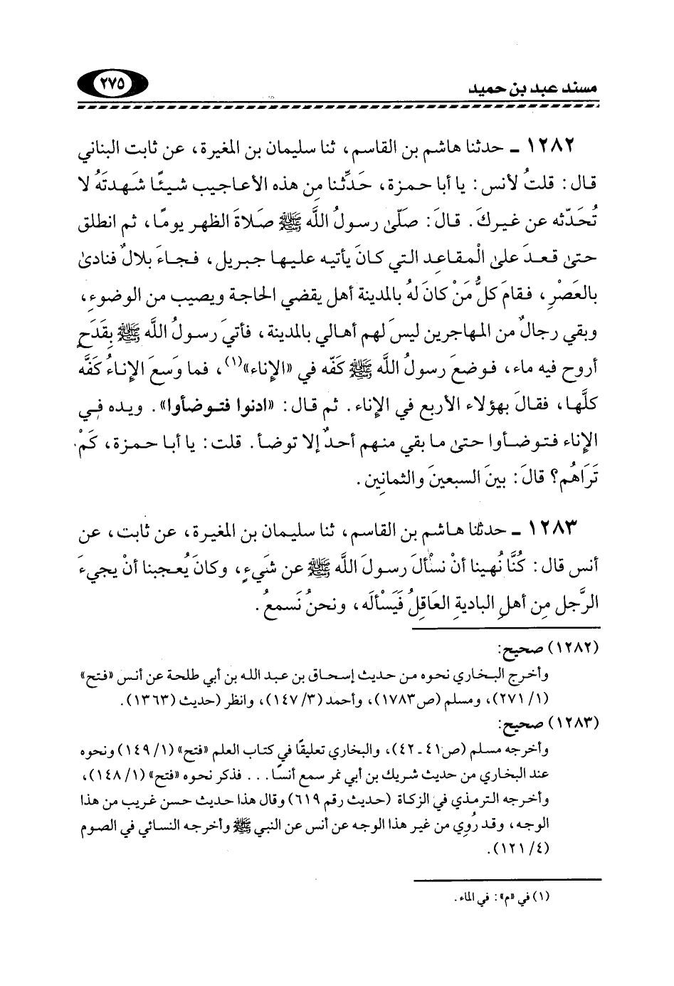 1282- حَدَّثَنَا هَاشِمُ بْنُ الْقَاسِمِ، ثَنَا سُلَيْمَانُ بْنُ الْمُغِيرَةِ، عَنْ ثَابِتٍ الْبُنَانِيِّ قَالَ: قُلْتُ لِأَنَسٍ: يَا أَبَا حَمْزَةَ، حَدِّثَنَا مِنْ هَذِهِ الْأَعَاجِيبِ شَيْئًا شَهِدْتَهُ لَا تُحَدِّثُهُ عَنْ غَيْرِكَ. قَالَ: صَلَّى رَسُولُ اللَّهِ -صَلَّى اللهُ عَلَيْهِ وَسَلَّمَ- صَلَاةَ الظُّهْرِ يَوْمًا، ثُمَّ انْطَلَقَ حَتَّى قَعَدَ عَلَى الْمَقَاعِدِ الَّتِي كَانَ يأتِيهِ عَلَيْهَا جِبْرِيلُ، فَجَاءَ بِلَالٌ فَنَادَى بِالْعَصْرِ، فَقَامَ كُلُّ مِنْ كَانَ لَهُ بِالْمَدِينَةِ أَهْلٌ يَقْضِي الْحَاجَةَ وَيُصِيبُ مِنَ الْوُضُوءِ، وَبَقِيَ رِجَالٌ مِنَ الْمُهَاجِرِينَ لَيْسَ لَهُمْ أَهَالي بِالْمَدِينَةِ، فَأُتِيَ رَسُولُ اللَّهِ -صَلَّى اللهُ عَلَيْهِ وَسَلَّمَ- بِقَدَحٍ أَرْوَحَ فِيهِ مَاءٌ، فَوَضَعَ رَسُولَ اللَّهِ -صَلَّى اللهُ عَلَيْهِ وَسَلَّمَ- كَفَّهُ فِي "الْإِنَاءِ"1، فَمَا وَسِعَ الْإِنَاءُ كَفَّهُ كُلَّهَا، فَقَالَ بِهَؤُلَاءِ الْأَرْبَعِ فِي الْإِنَاءِ. ثُمَّ قَالَ: "ادْنُوا فَتَوَضَّئُوا". وَيَدُهُ فِي الْإِنَاءِ فَتَوَضَّئُوا حَتَّى مَا بَقِيَ مِنْهُمْ أَحَدٌ إِلَّا تَوَضَّأَ. قُلْتُ: يَا أَبَا حَمْزَةَ، كَمْ تَرَاهُمْ؟ قَالَ: بَيْنَ السَّبْعِينَ وَالثَّمَانِينَ.