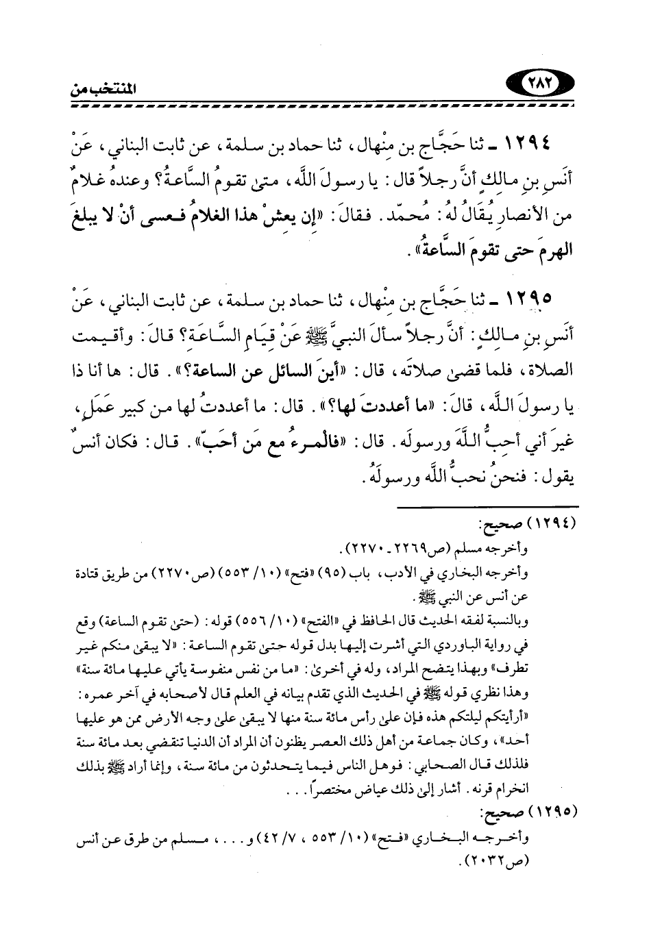 1295- ثنا حَجَّاجُ بْنُ مِنْهَالٍ، ثَنَا حَمَّادُ بْنُ سَلَمَةَ، عَنْ ثَابِتٍ الْبُنَانِيِّ، عَنْ أَنَسِ بْنِ مَالْكٍ: أَنَّ رَجُلًا سَأَلَ النَّبِيَّ -صَلَّى اللهُ عَلَيْهِ وَسَلَّمَ- عَنْ قِيَامِ السَّاعَةِ؟ قَالَ: وَأُقِيمَتِ الصَّلَاةُ، فَلَمَّا قَضَى صَلَاتَهُ، قَالَ: "أَيْنَ السَّائِلُ عَنِ الساعة؟ ". قال: هأنذا يَا رَسُولَ اللَّهِ، قَالَ: "مَا أَعْدَدْتَ لَهَا؟ ". قَالَ: مَا أَعْدَدْتُ لَهَا مِنْ كَبِيرِ عَمَلٍ، غَيْرَ أَنِّي أُحِبُّ اللَّهَ وَرَسُولَهُ. قَالَ: "فَالْمَرْءُ مَعَ مَنْ أَحَبَّ". قَالَ: فَكَانَ أَنَسٌ يَقُولُ: فَنَحْنُ نُحِبُّ الله ورسوله.