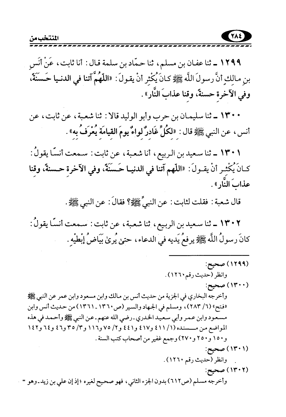 1299- ثنا عَفَّانُ بْنُ مُسْلِمٍ، ثَنَا حَمَّادُ بْنُ سَلَمَةَ قَالَ: أنا ثَابِتٍ، عَنْ أَنَسِ بْنِ مَالْكٍ أَنَّ رَسُولَ اللَّهِ -صَلَّى اللهُ عَلَيْهِ وَسَلَّمَ- كَانَ يُكْثِرُ أَنْ يقول: "اللهم آتننا فِي الدُّنْيَا حَسَنَةً، وَفِي الْآخِرَةِ حسنة، وقتا عَذَابَ النَّارِ".