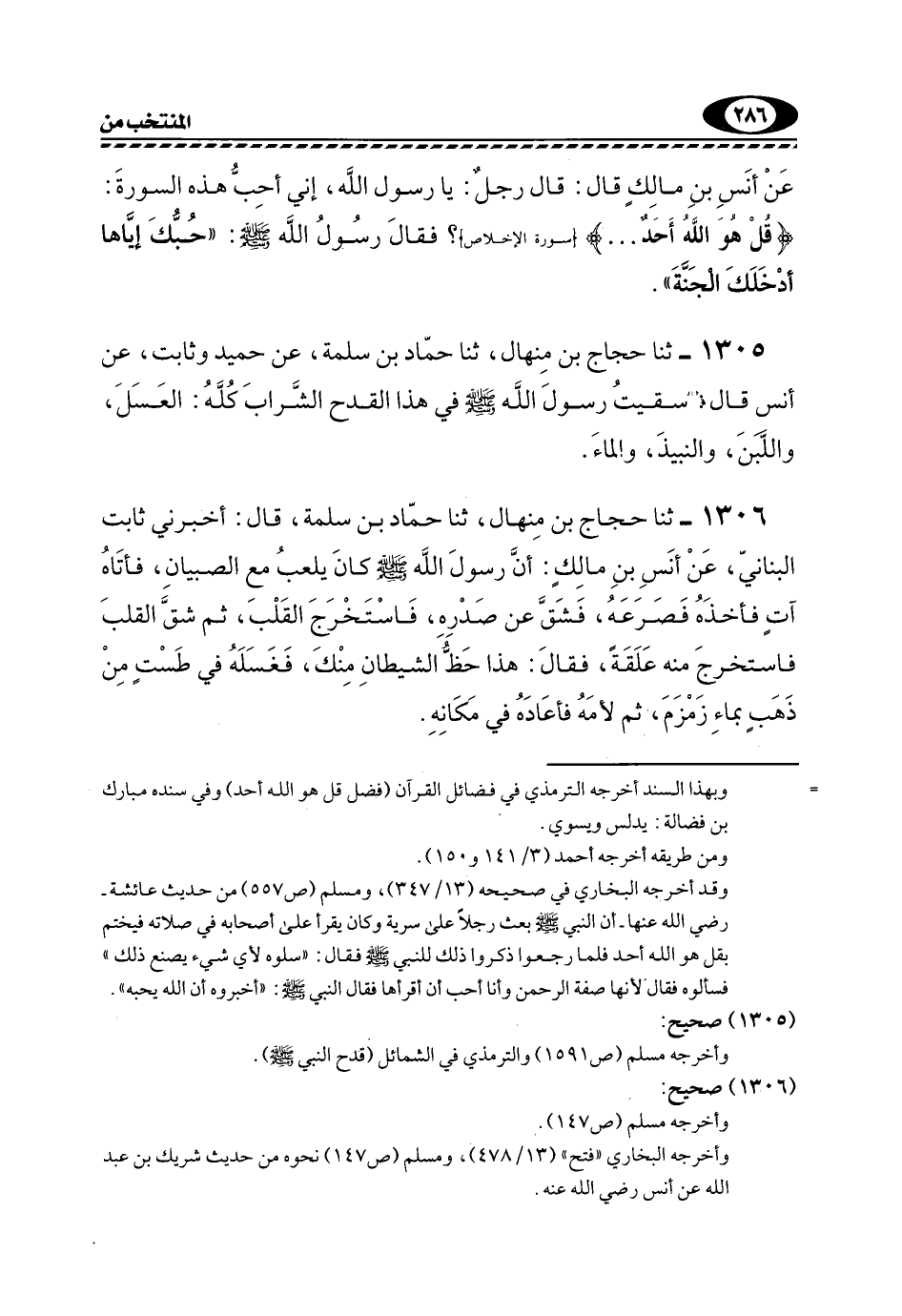 1306- ثنا حَجَّاجُ بْنُ مِنْهَالٍ، ثَنَا حَمَّادُ بْنُ سَلَمَةَ، قَالَ: أَخْبَرَنِي ثَابِتٌ الْبُنَانِيُّ، عَنْ أَنَسِ بْنِ مَالْكٍ: أَنَّ رَسُولَ اللَّهِ -صَلَّى اللهُ عَلَيْهِ وَسَلَّمَ- كَانَ يَلْعَبُ مَعَ الصِّبْيَانِ، فَأَتَاهُ آتٍ فأذحذه فَصَرَعَهُ، فَشَقَّ عَنْ صَدْرِهِ، فَاسْتَخْرَجَ الْقَلْبَ، ثُمَّ شَقَّ الْقَلْبَ فَاسْتَخْرَجَ مِنْهُ عَلَقَةً، فَقَالَ: هَذَا حَظُّ الشَّيْطَانِ مِنْكَ، فَغَسَلَهُ فِي طَسْتٍ مِنْ ذَهَبٍ بِمَاءِ زَمْزَمَ، ثُمَّ لأمه فأعاده في مكانه.