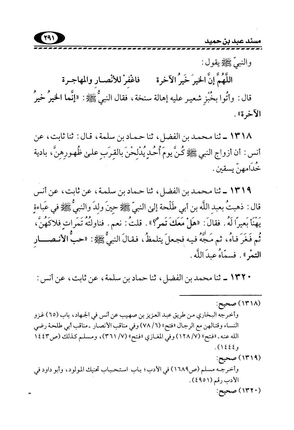 1319- ثنا مُحَمَّدُ بْنُ الْفَضْلِ، ثَنَا حَمَّادُ بْنُ سَلَمَةَ، عَنْ ثابت، عن أنس قال: ذَهَبْتُ بِعَبْدِ اللَّهِ بْنِ أَبِي طَلْحَةَ إِلَى النَّبِيِّ -صَلَّى اللهُ عَلَيْهِ وَسَلَّمَ- حِينَ وُلِدَ وَالنَّبِيُّ -صَلَّى اللهُ عَلَيْهِ وَسَلَّمَ- فِي عَبَاءَةٍ يَهْنَأُ بَعِيرًا لَهُ. فَقَالَ: "هَلْ مَعَكَ تَمْرٌ؟ ". قُلْتُ: نَعَمْ. فَنَاوَلْتُهُ تَمَرَاتٍ فَلَاكَهُنَّ، ثُمَّ فَغَرَ فَاهَ، ثُمَّ مَجَّهُ فِيهِ فَجَعَلَ يتملظ، فَقَالَ النَّبِيُّ -صَلَّى اللهُ عَلَيْهِ وَسَلَّمَ: "حُبُّ الْأَنْصَارِ التَّمْرَ". فَسَمَّاهُ عَبْدَ اللَّهِ.