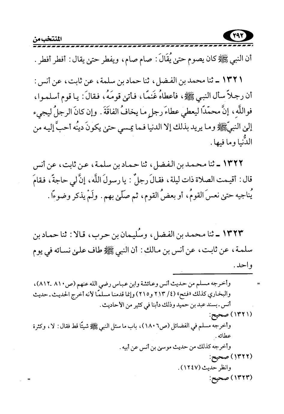 1321- ثنا مُحَمَّدُ بْنُ الْفَضْلِ، ثَنَا حَمَّادُ بْنُ سَلَمَةَ، عَنْ ثَابِتٍ، عَنْ أَنَسٍ: أَنَّ رَجُلًا سَأَلَ النَّبِيَّ -صَلَّى اللهُ عَلَيْهِ وَسَلَّمَ- فَأَعْطَاهُ غَنَمًا، فَأَتَى قَوْمَهُ، فَقَالَ: يَا قَوْمِ أَسْلِمُوا، فَوَاللهِ، إِنَّ مُحَمَّدًا لَيُعْطِي عَطَاءَ رَجُلٍ مَا يَخَافُ الْفَاقَةَ. وَإِنْ كَانَ الرَّجُلُ لَيَجِيءُ إِلَى النَّبِيِّ -صَلَّى اللهُ عَلَيْهِ وَسَلَّمَ- وَمَا يُرِيدُ بِذَلِكَ إِلَّا الدُّنْيَا فَمَا يُمْسِي حَتَّى يَكُونَ دِينُهُ أَحَبَّ إِلَيْهِ مِنَ الدُّنْيَا وَمَا فِيهَا.