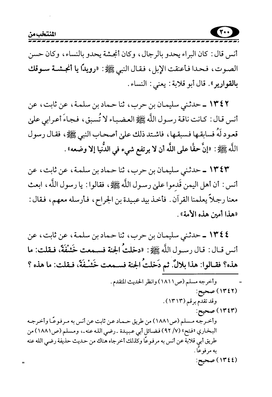 1344- حَدَّثَنِي سُلَيْمَانُ بْنُ حَرْبٍ، ثَنَا حَمَّادُ بْنُ سَلَمَةَ، عَنْ ثَابِتٍ، عَنْ أَنَسٍ قَالَ: قَالَ رَسُولُ اللَّهِ -صَلَّى اللهُ عَلَيْهِ وَسَلَّمَ: "دَخَلْتُ الْجَنَّةَ فَسَمِعْتُ خَشَفَةً، فَقُلْتُ: مَا هَذِهِ؟ فَقَالُوا: هَذَا بِلَالٌ. ثُمَّ دَخَلْتُ الْجَنَّةَ فَسَمِعْتُ خَشَفَةً، فقلت: ما هذه؟