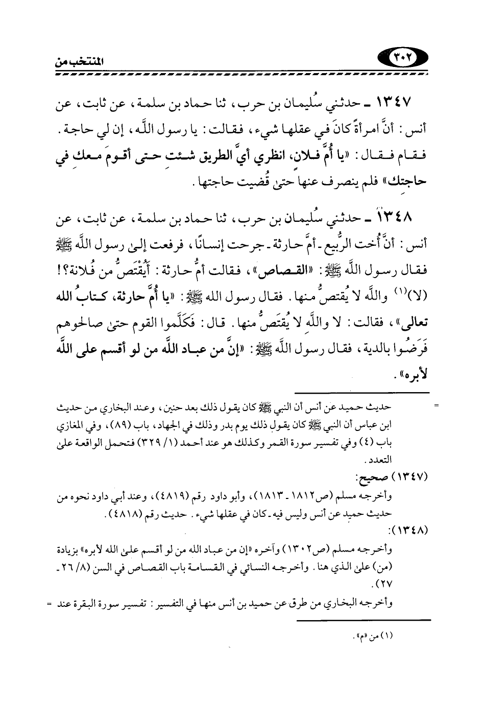 1348- حَدَّثَنِي سُلَيْمَانُ بْنُ حَرْبٍ، ثَنَا حَمَّادُ بْنُ سَلَمَةَ، عَنْ ثَابِتٍ، عَنْ أَنَسٍ: أَنَّ أُخْتَ الرَّبِيعِ -أُمَّ حَارِثَةَ- جَرَحَتْ إِنْسَانًا، فَرُفِعَتْ إِلَى رَسُولِ اللَّهِ -صَلَّى اللهُ عَلَيْهِ وَسَلَّمَ- فَقَالَ رَسُولُ اللَّهِ -صَلَّى اللهُ عَلَيْهِ وَسَلَّمَ: "الْقِصَاصُ"، فَقَالَتْ أُمُّ حَارِثَةَ: أَيُقْتَصُّ مِنْ فلانة؟! "لَا"1 وَاللهِ لَا يُقْتَصُّ مِنْهَا. فَقَالَ رَسُولُ اللَّهِ -صَلَّى اللهُ عَلَيْهِ وَسَلَّمَ: "يَا أُمَّ حَارِثَةَ، كِتَابُ اللَّهِ تَعَالَى"، فَقَالَتْ: لَا وَاللهِ لَا يُقْتَصُّ مِنْهَا. قَالَ: فكََلَّموا الْقَوْمَ حَتَّى صَالَحُوهُمْ فَرَضُوا بِالدِّيَةِ، فَقَالَ رَسُولُ اللَّهِ -صَلَّى اللهُ عَلَيْهِ وَسَلَّمَ: "إِنَّ مِنَ عِبَادِ اللَّهِ مَنْ لَوْ أَقْسَمَ على الله لأبره".