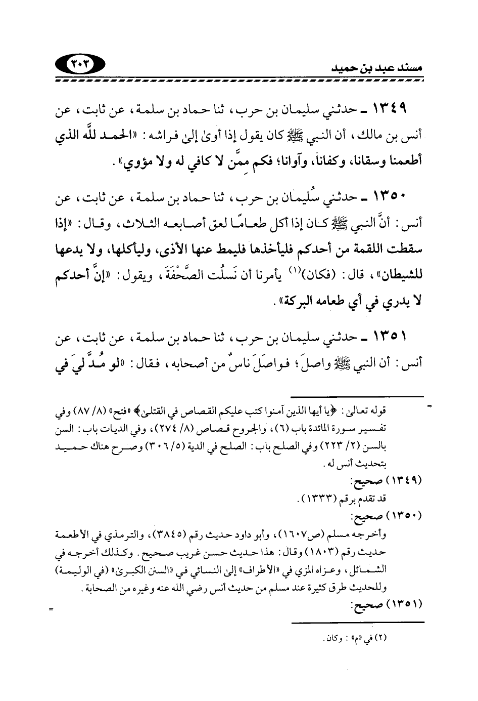 1349- حَدَّثَنِي سُلَيْمَانُ بْنُ حَرْبٍ، ثَنَا حَمَّادُ بْنُ سَلَمَةَ، عَنْ ثَابِتٍ، عَنْ أَنَسِ بْنِ مَالْكٍ، أَنَّ النَّبِيَّ -صَلَّى اللهُ عَلَيْهِ وَسَلَّمَ- كَانَ يَقُولُ إِذَا أَوَى إِلَى فِرَاشِهِ: "الْحَمْدُ لِلَّهِ الَّذِي أَطْعَمَنَا وَسَقَانَا، وَكَفَانَا، وَآوَانَا؛ فَكَمْ مِمَّنْ لا كافي له ولا مئوي".