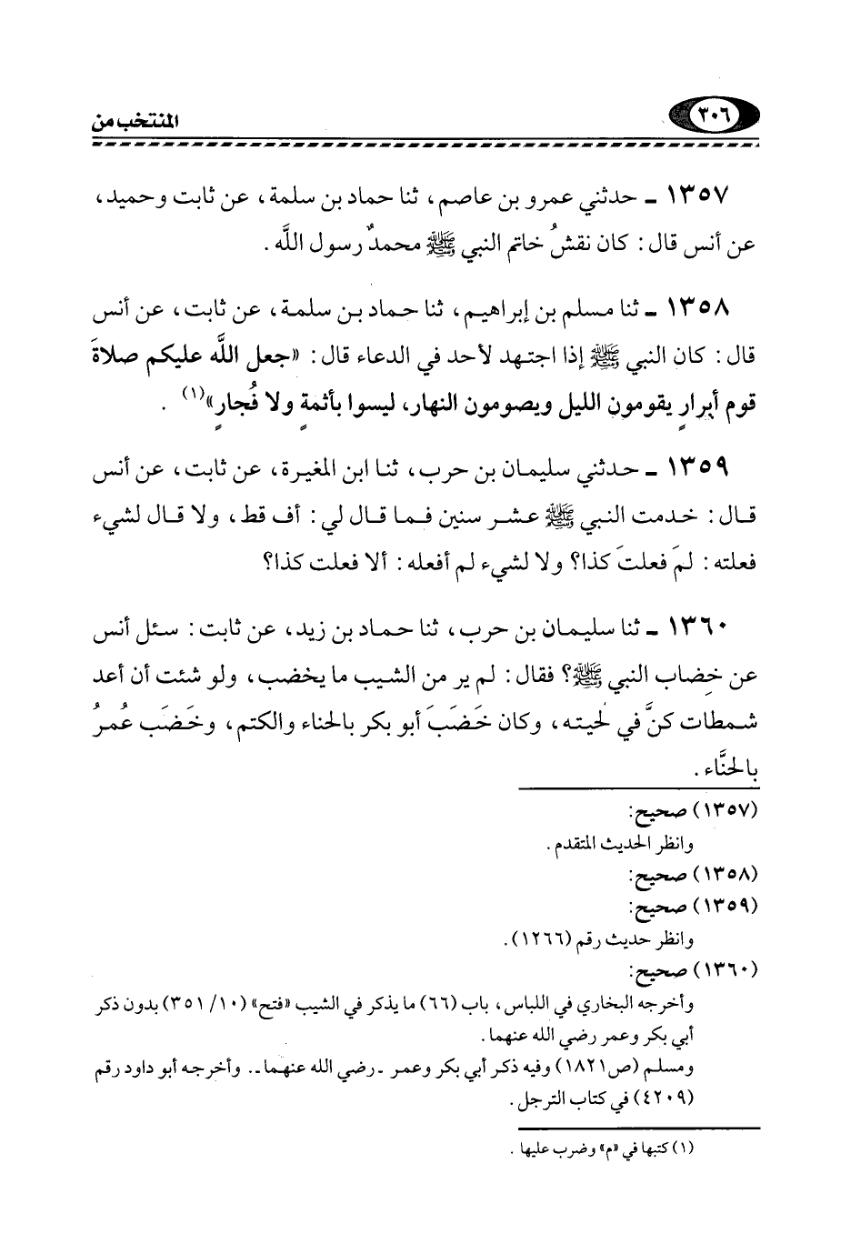 1360- ثنا سُلَيْمَانُ بْنُ حَرْبٍ، ثَنَا حَمَّادُ بْنُ زَيْدِ، عَنْ ثَابِتٍ، سُئِلَ أَنَسٌ عَنْ خِضَابِ النَّبِيِّ -صَلَّى اللهُ عَلَيْهِ وَسَلَّمَ- فَقَالَ: لَمْ يَرَ مِنَ الشَّيْبِ مَا يَخْضِبُ، وَلَوْ شِئْتُ أَنْ أَعُدَّ شَمَطَاتٍ كُنَّ في لحيته، وكان خضب أبو بَكْرٍ بِالْحِنَّاءِ وَالْكَتَمِ، وَخَضَبَ عُمَرُ بالحناء.