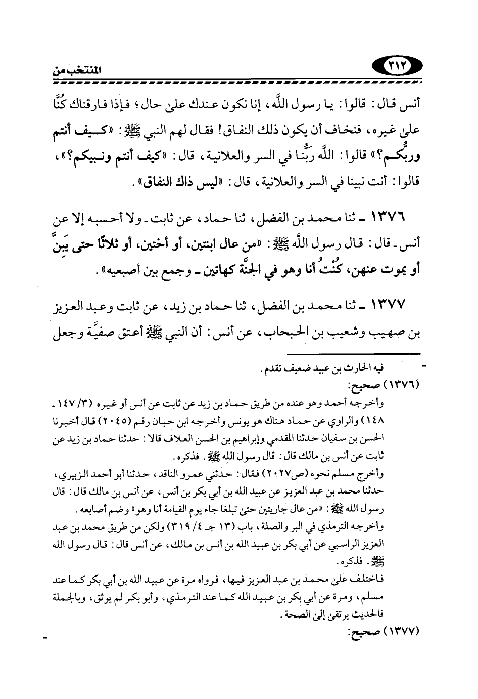 1377- ثنا مُحَمَّدُ بْنُ الْفَضْلِ، ثَنَا حَمَّادُ بْنُ زَيْدٍ، عَنْ ثَابِتٍ وَعَبْدُ الْعَزِيزِ بْنُ صُهَيْبٍ وَشُعَيْبُ بْنُ الْحَبْحَابِ، عَنْ أَنَسٍ: أَنَّ النَّبِيَّ -صَلَّى اللهُ عَلَيْهِ وَسَلَّمَ- أَعْتَقَ صَفِيَّةَ وجعل